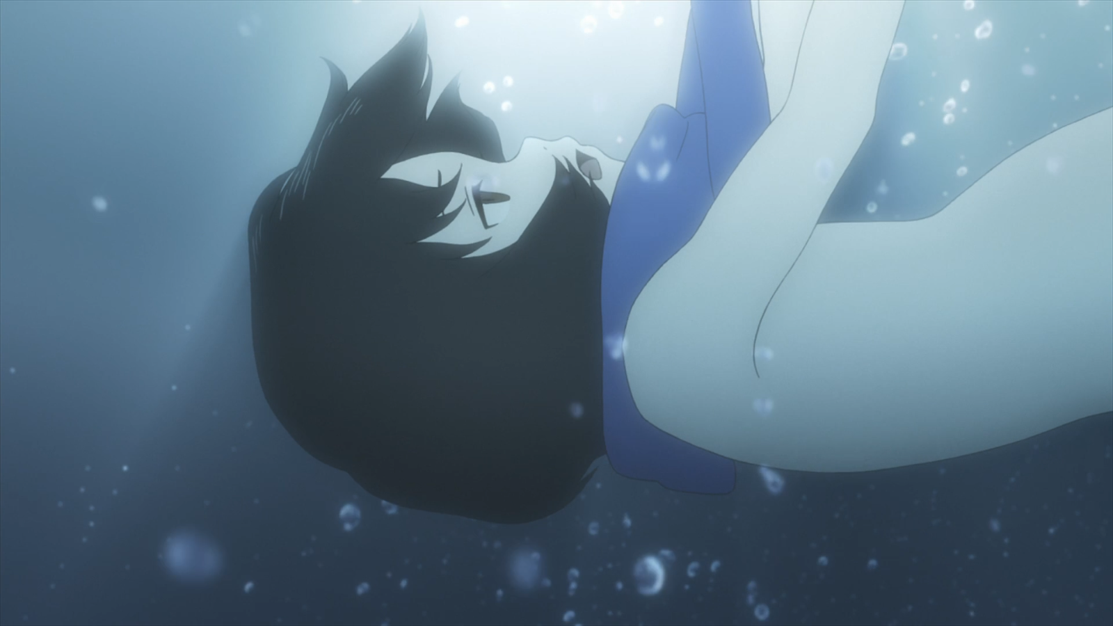 Description: A woman laying on top of a bed under water next to a cat head on a pillow in a blue room.