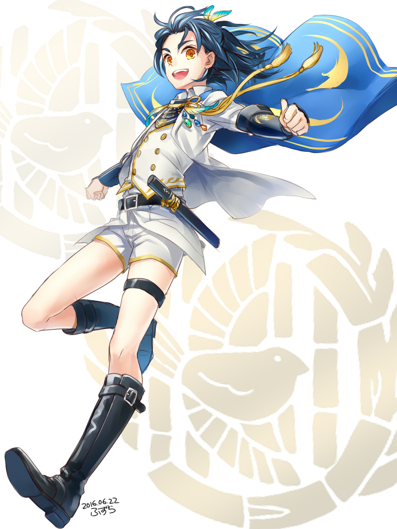 Description: A woman in a uniform is flying through the air with a blue cape on her head and a blue cape on her shoulder.