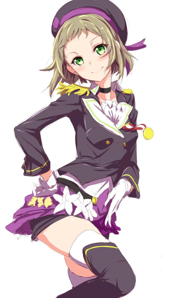 Description: A woman in a uniform with a hat and a skirt on her knees.