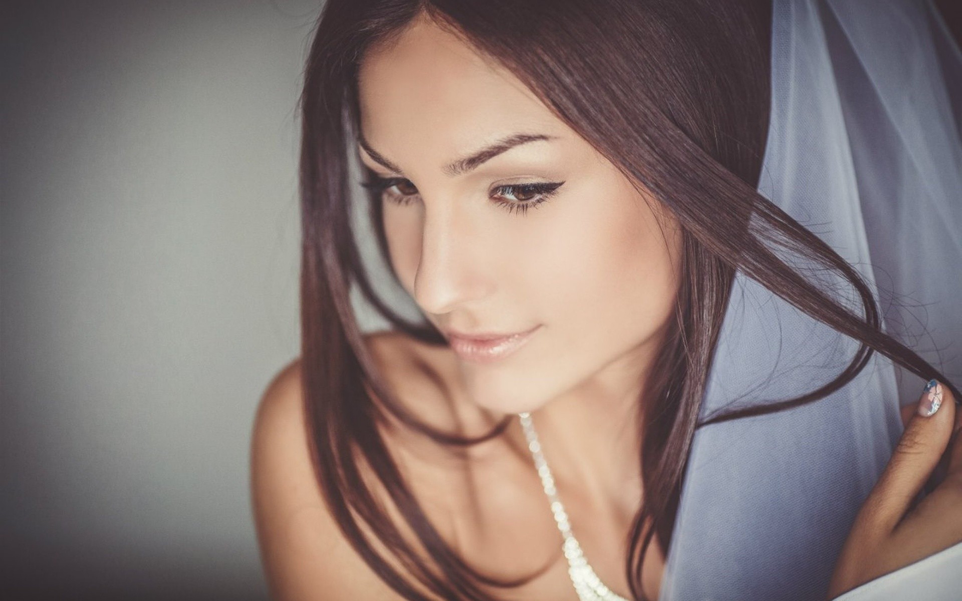 Description: A woman with a veil on her head and a necklace on her neck.