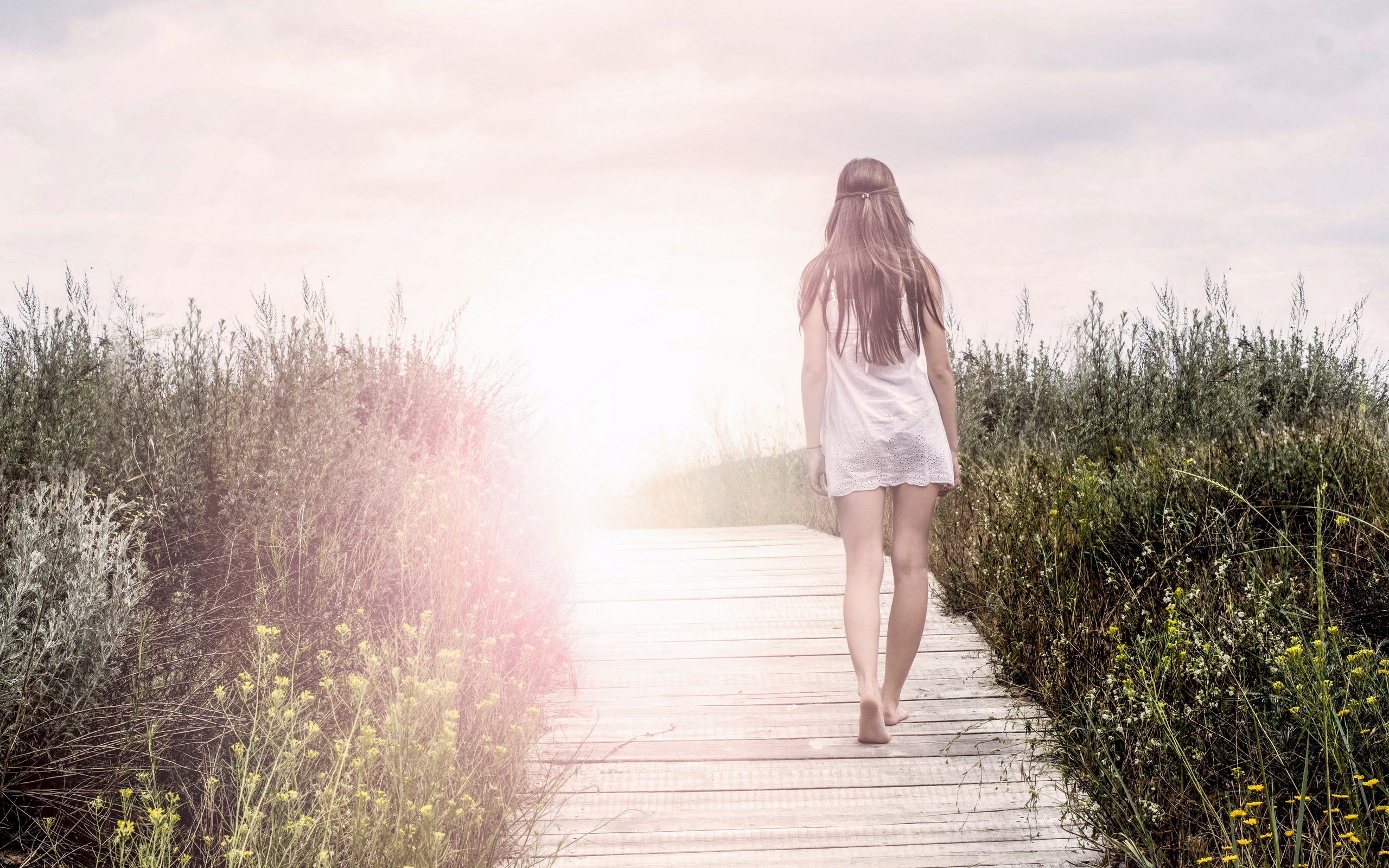 Description: A woman walking down a wooden walkway in a field of flowers and grass with the sun shining through the clouds.