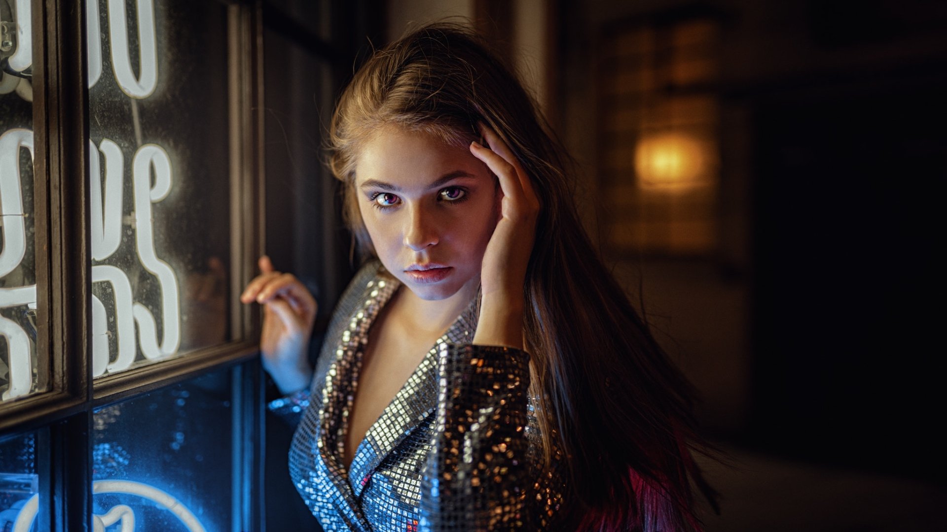 Description: A woman leaning against a wall with a clock on it's side and a neon sign behind her.