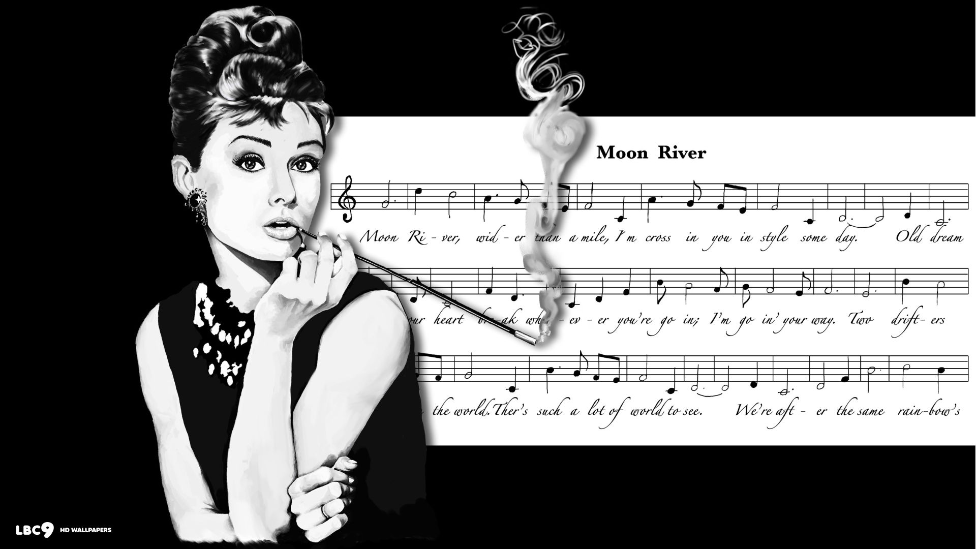 Description: A woman holding a wand in her hand and a sheet of music behind her with notes on it and a black background.