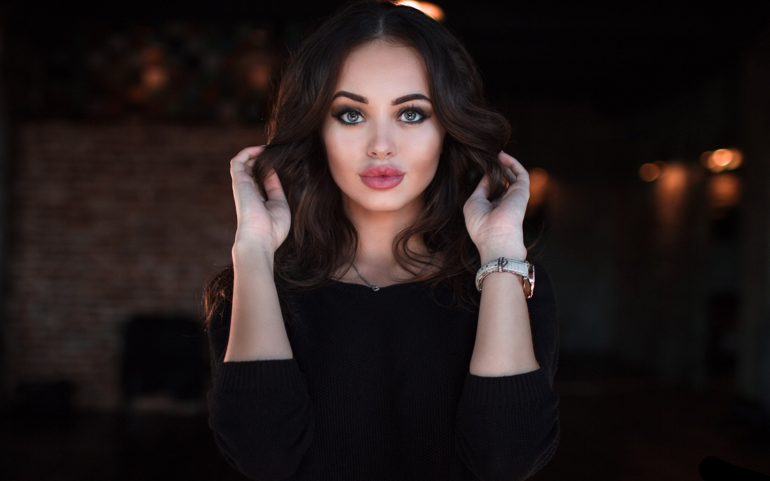 Description: A woman with a watch on her wrist posing for a picture in a dark room with a brick wall.