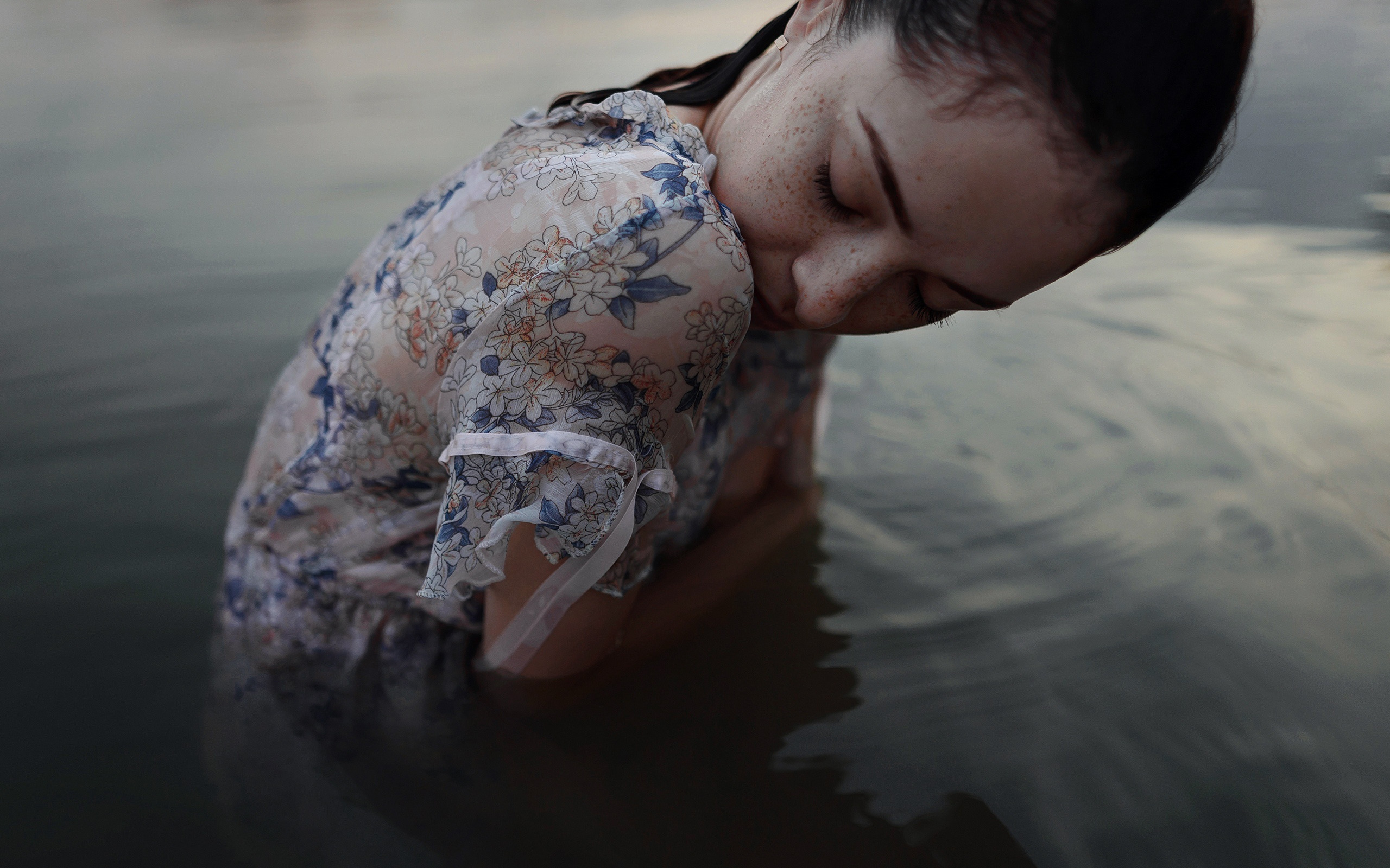 Description: A woman is in the water with her head in her hands and her eyes closed.