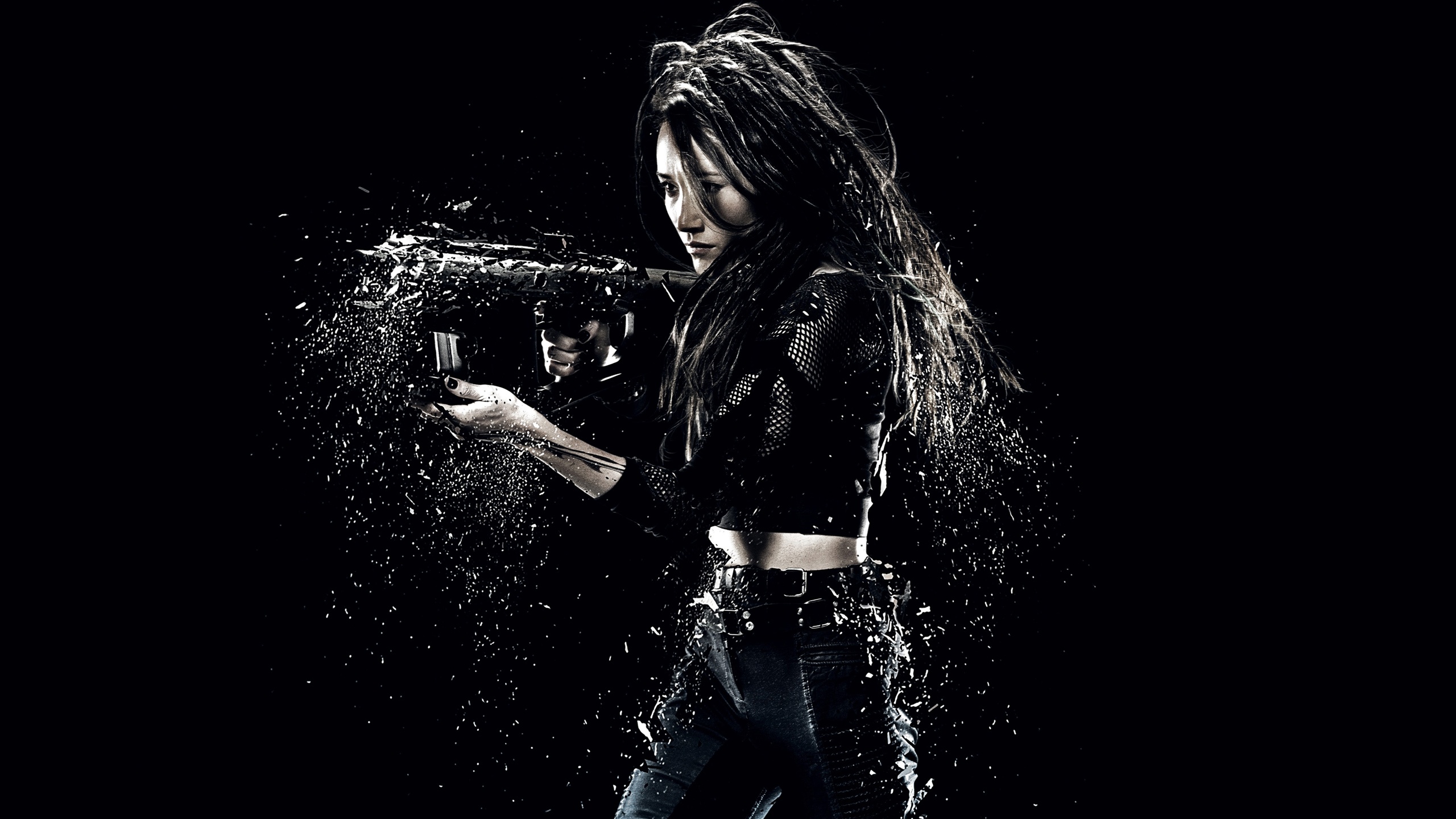 Description: A woman holding a gun in the water with a splash of water on her face and a black background.