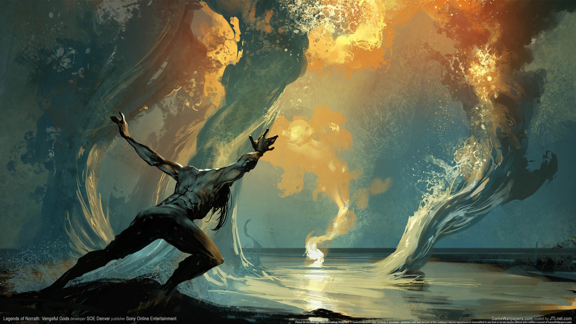Description: A painting of a woman standing in front of a giant wave of water with her arms up in the air.
