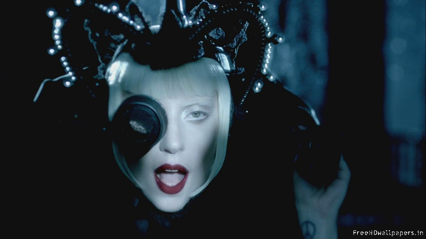 Description: A woman with a weird headpiece and a weird nosepiece in a dark room with lights on her head.