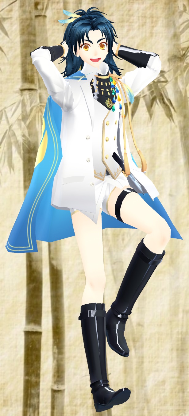 Description: A woman in a white coat and black boots is standing in front of bamboo trees and holding a sword.