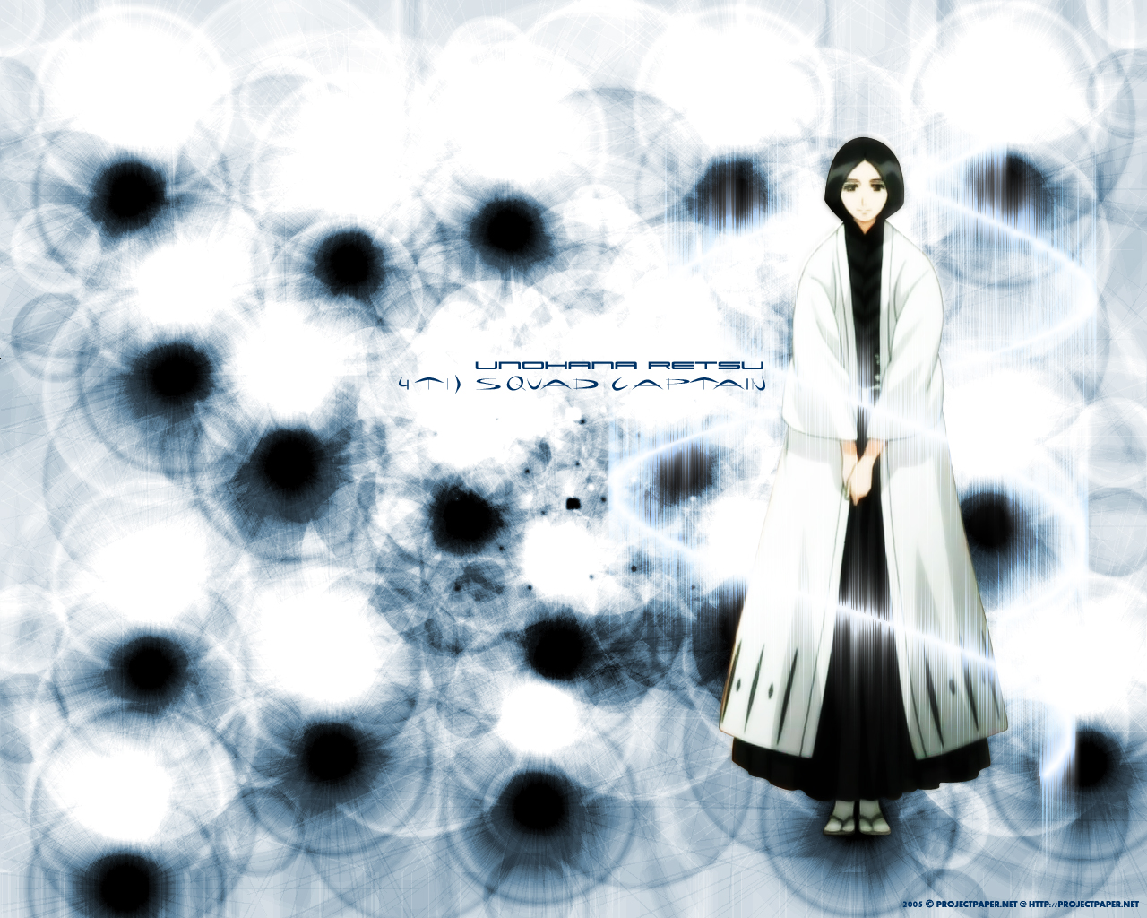 Description: A woman in a white coat and black dress standing in front of a wall of circles and circles with a black and white background.