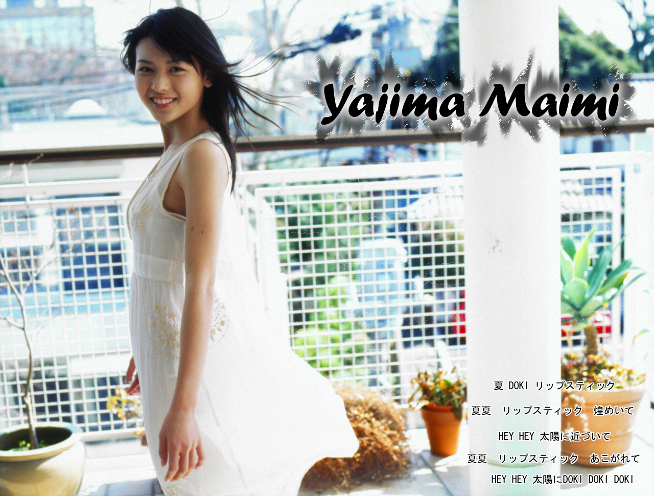 Description: A woman in a white dress standing on a balcony with a plant in the background and a window behind her.