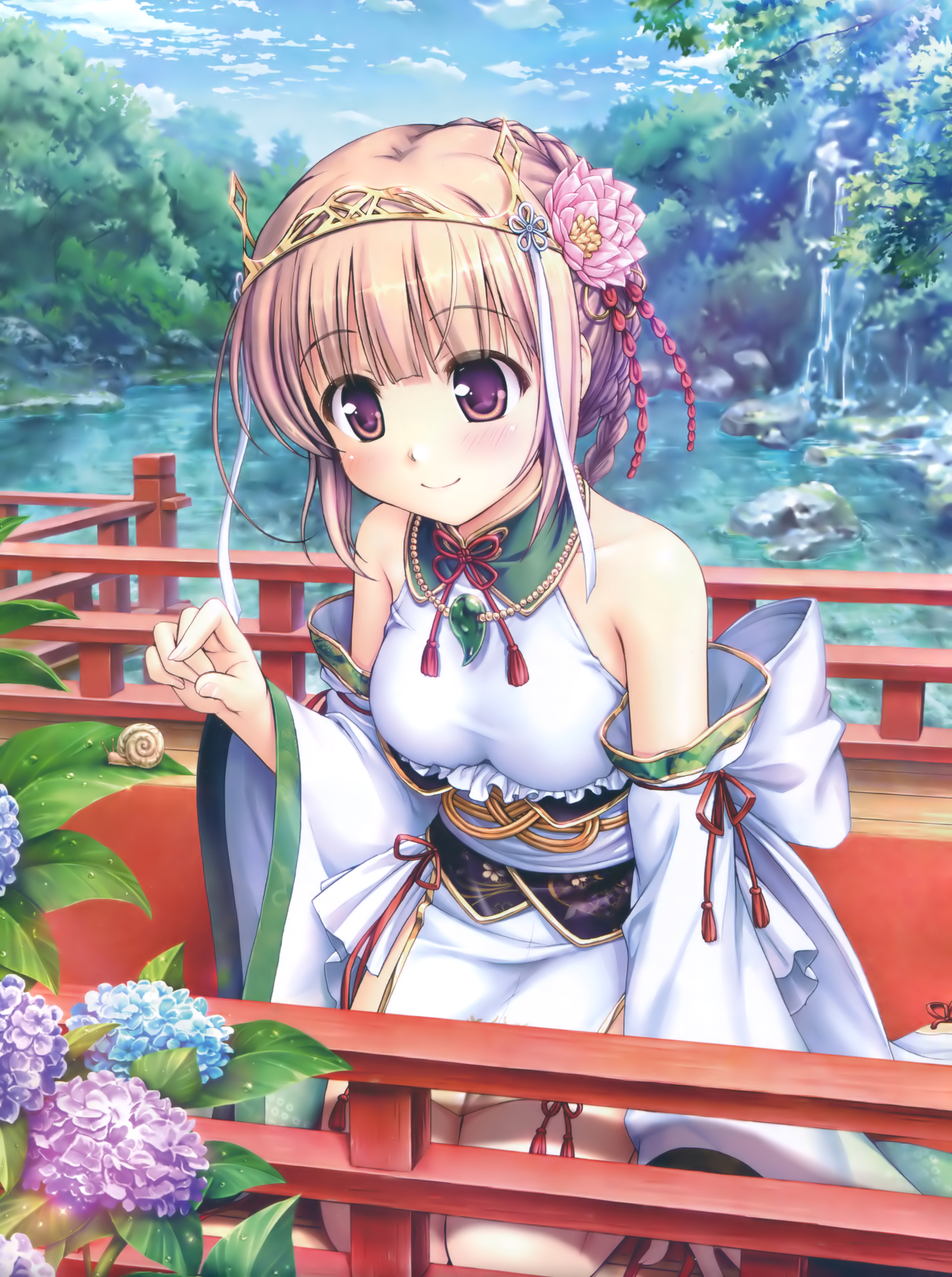 Description: A woman in a white dress is sitting on a bench with flowers in her hair and a flower in her hair.