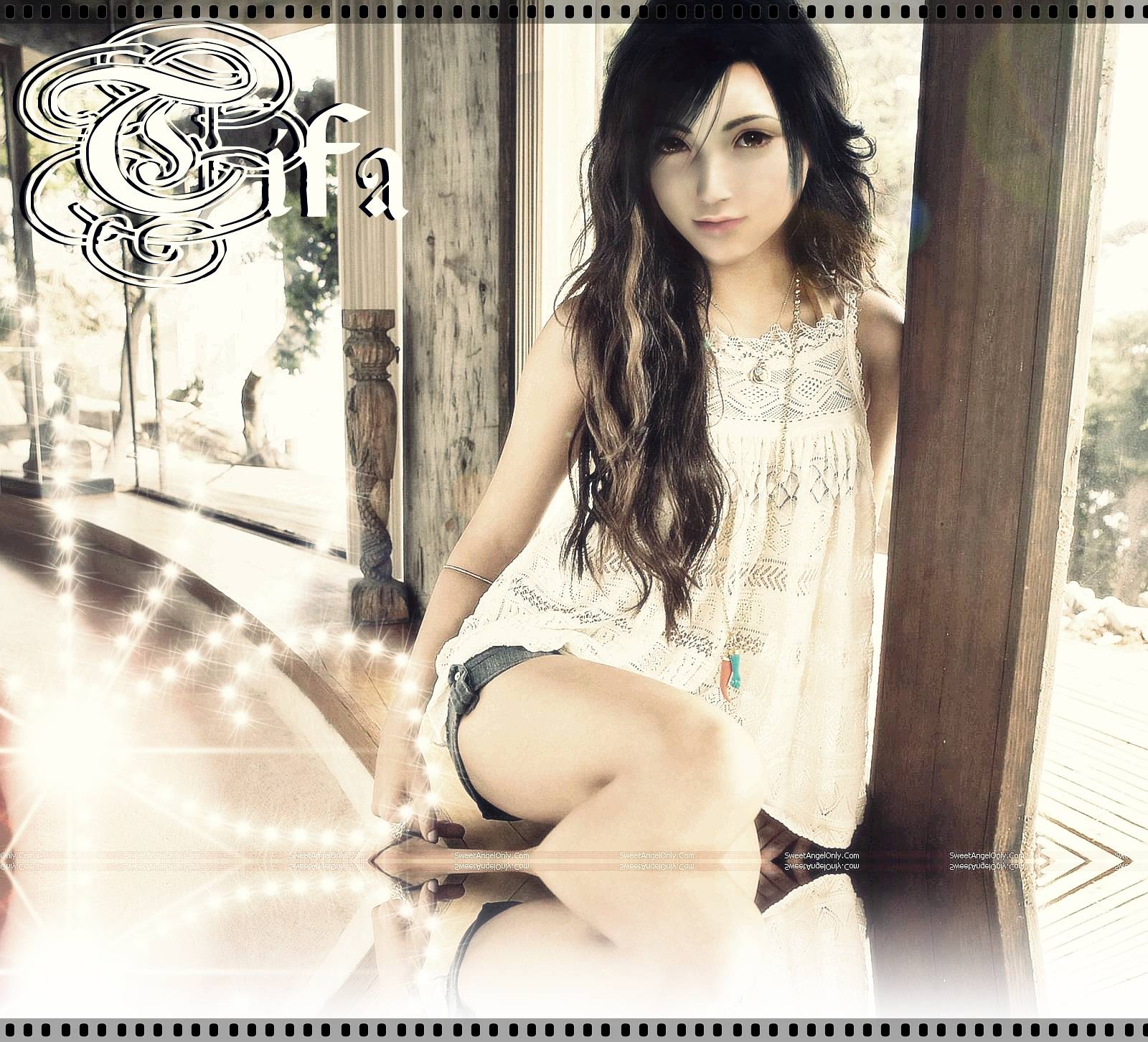 Description: A woman in a white dress sitting on a bench with a light shining on her leg and her hand on her hip.