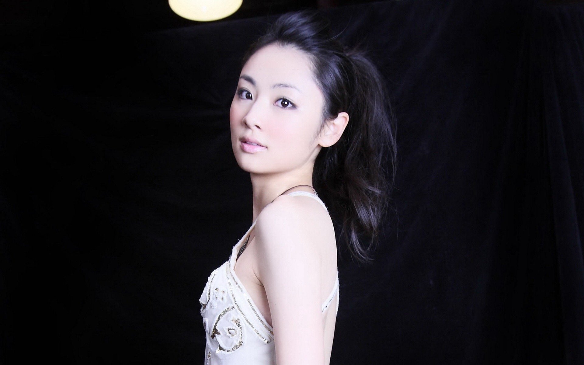 Description: A woman in a white dress posing for a picture with a black background and lights behind her.