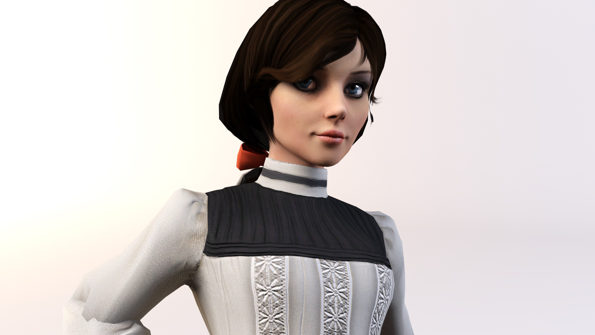 Description: A woman in a white dress with a black collar and a red earring on her head and a white background.