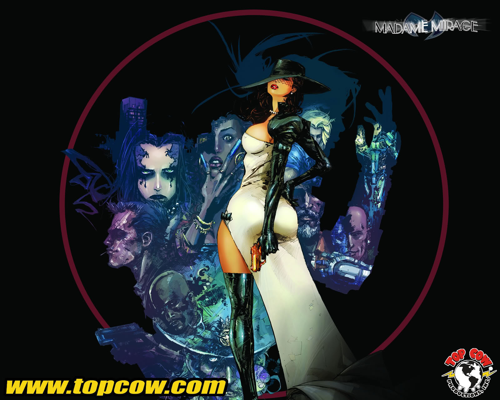 Description: A woman in a white dress and a black hat with a gun in her hand and a bunch of zombies behind her.