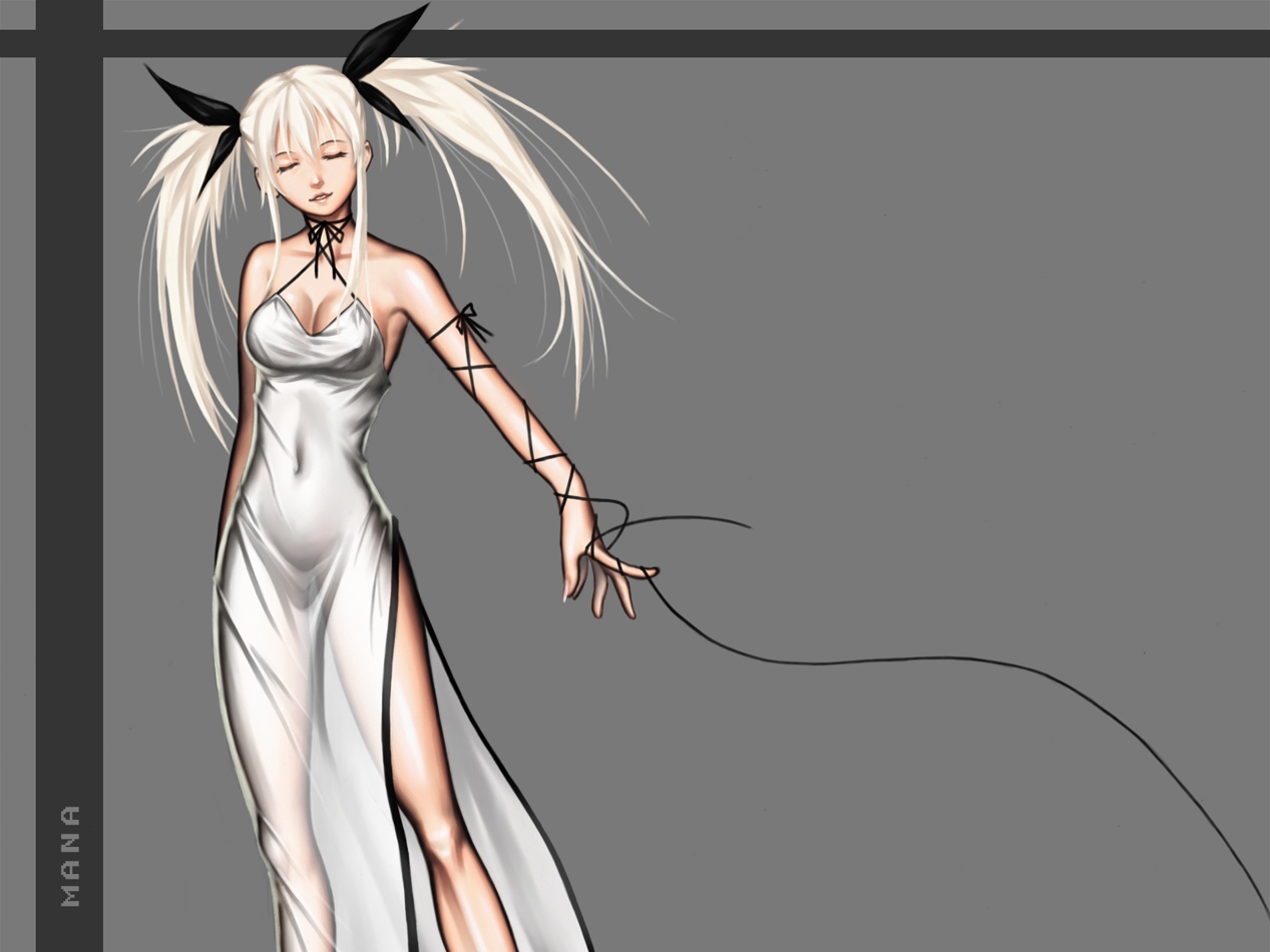 Description: A woman in a white dress with black hair and a long white dress with black horns and a long white dress with a slit.