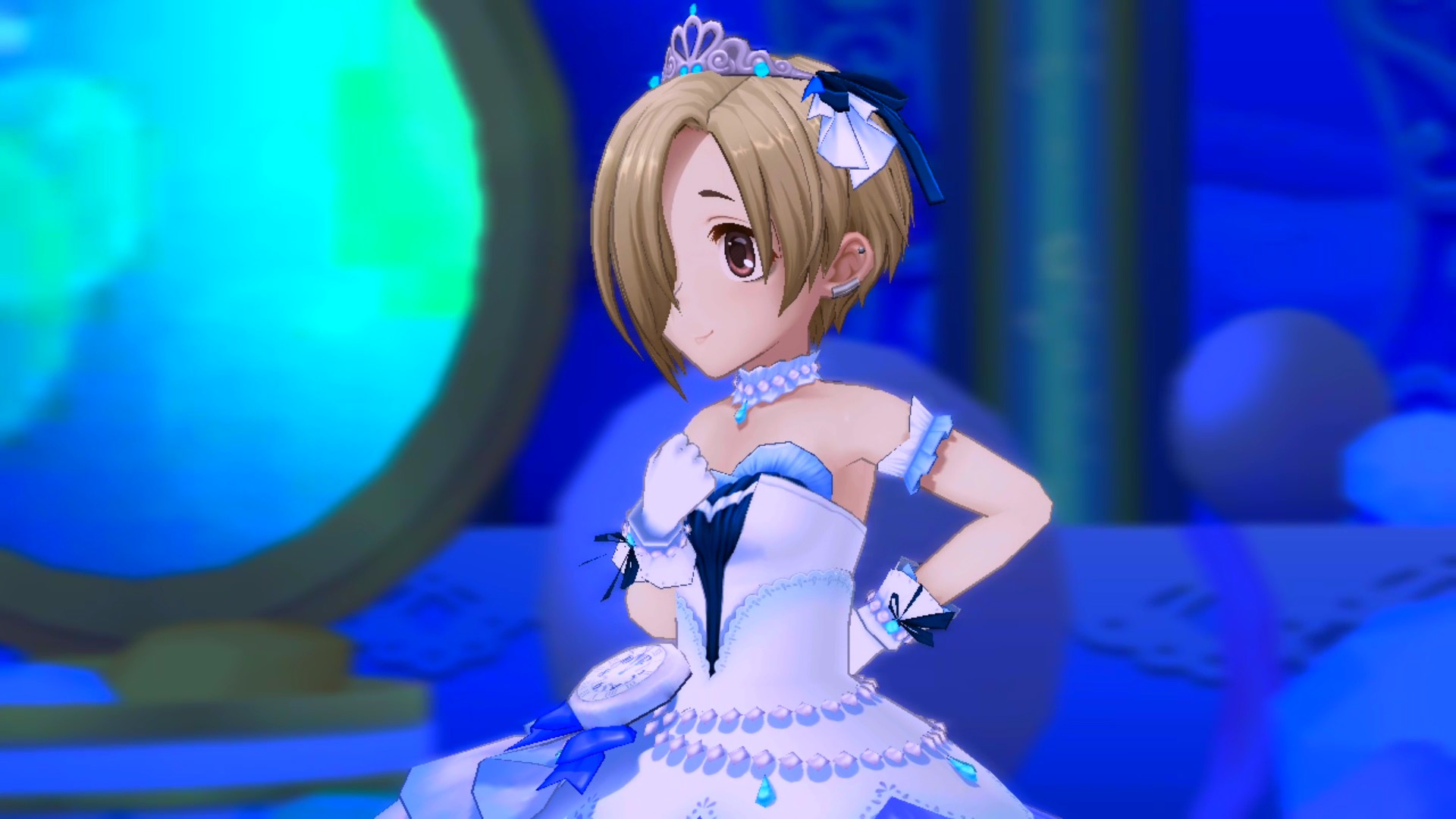 Description: A woman in a white dress standing in front of a blue background with a blue light behind her and a blue light behind her.