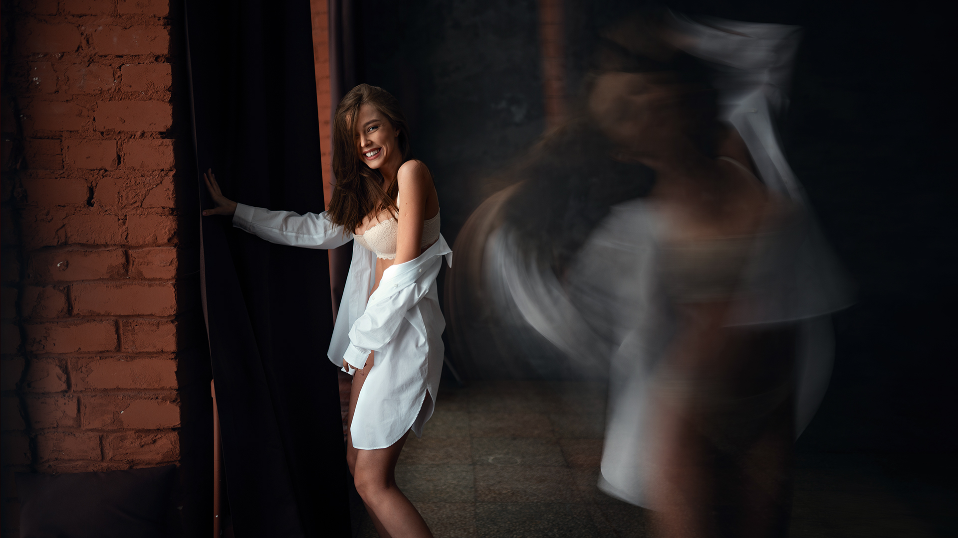 Description: A woman in a white dress standing next to a brick wall and a man in a white shirt behind her.