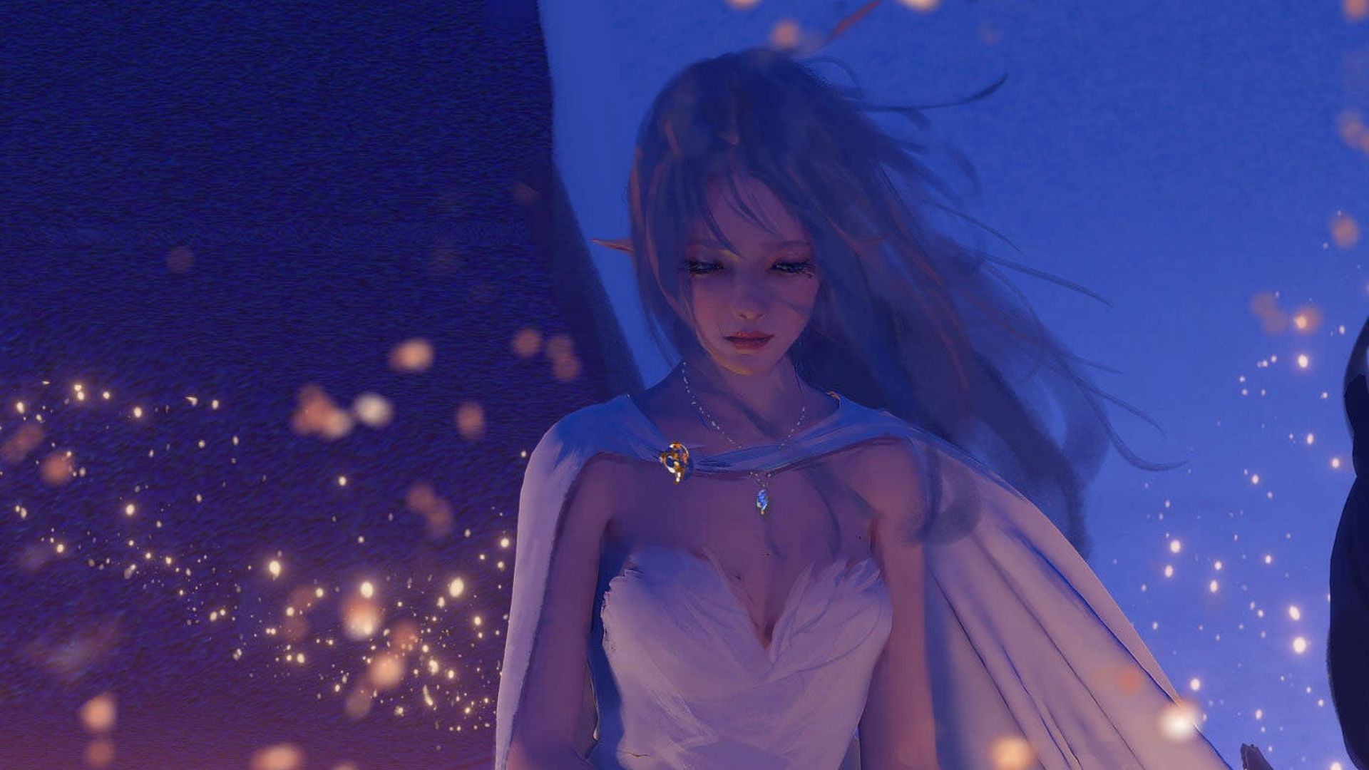 Description: A woman in a white dress with a white cape on her shoulders and a white cape on her shoulder.