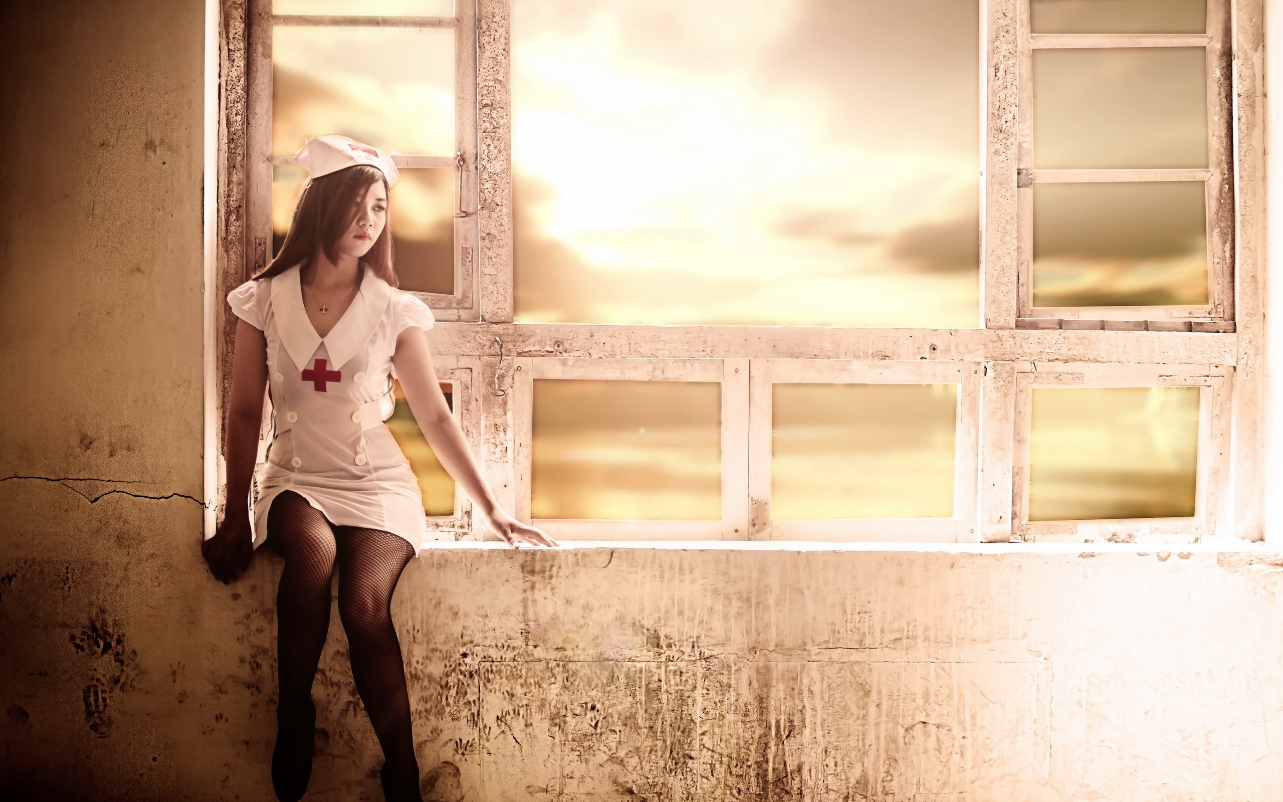 Description: A woman in a white dress leaning against a wall with a cross on it's chest and a red cross on her chest.