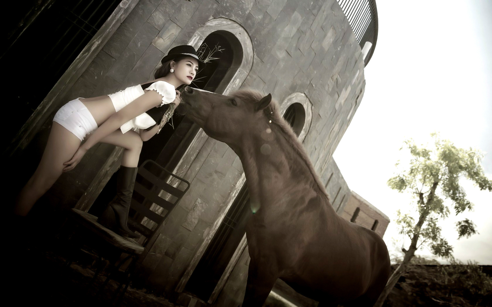 Description: A woman in a white dress is feeding a horse a bottle of milk in front of a building with a clock tower.