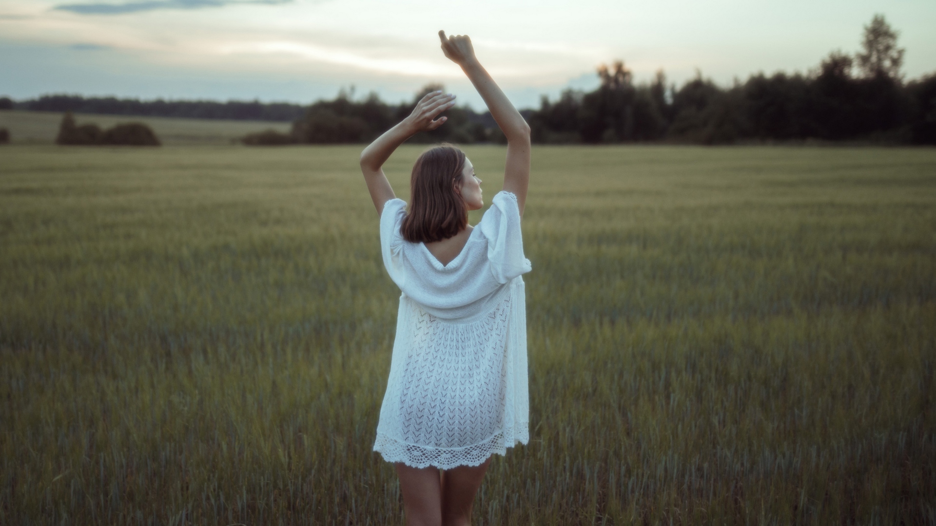 Description: A woman in a white dress standing in a field of grass with her arms up in the air and her hands raised.