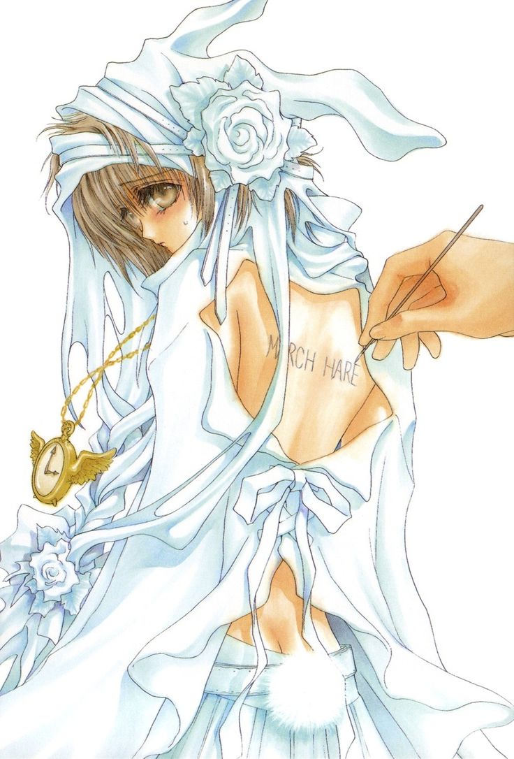 Description: A drawing of a woman in a white dress with a flower on her head and a ring in her hand.
