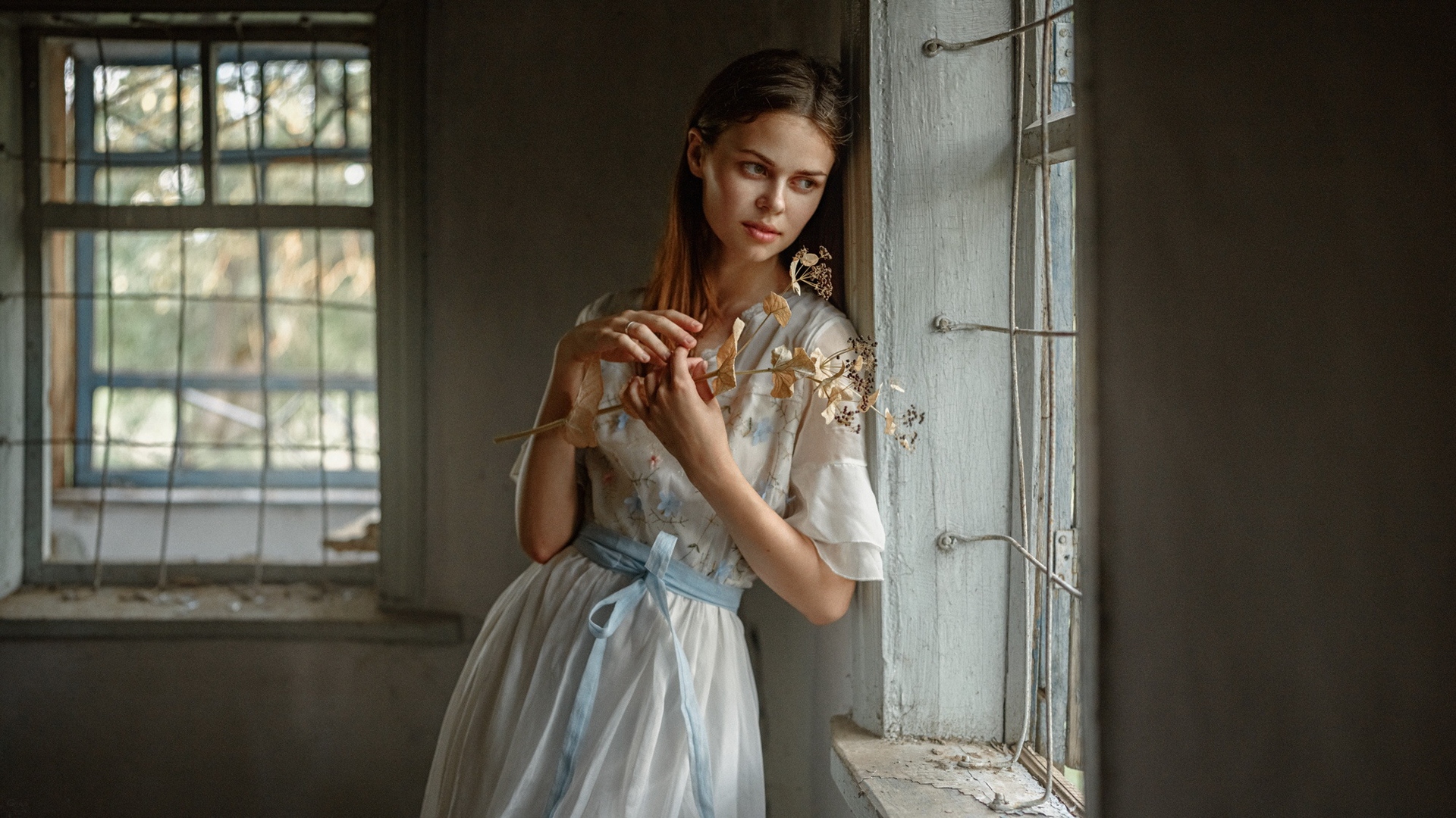 Description: A woman in a white dress standing by a window with a flower in her hand and looking at the camera.