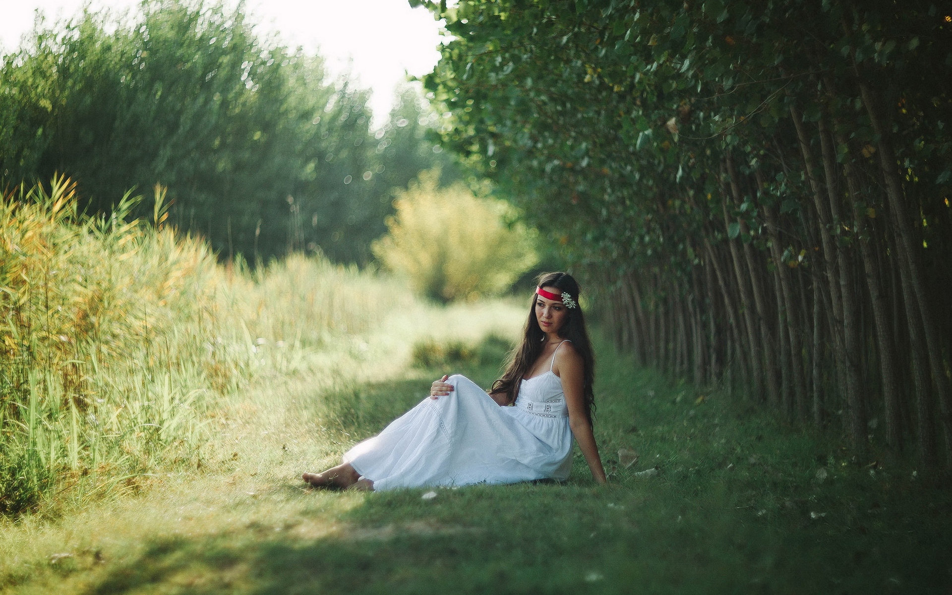 Description: A woman in a white dress sitting on a grass covered path in the woods with a hat on her head.