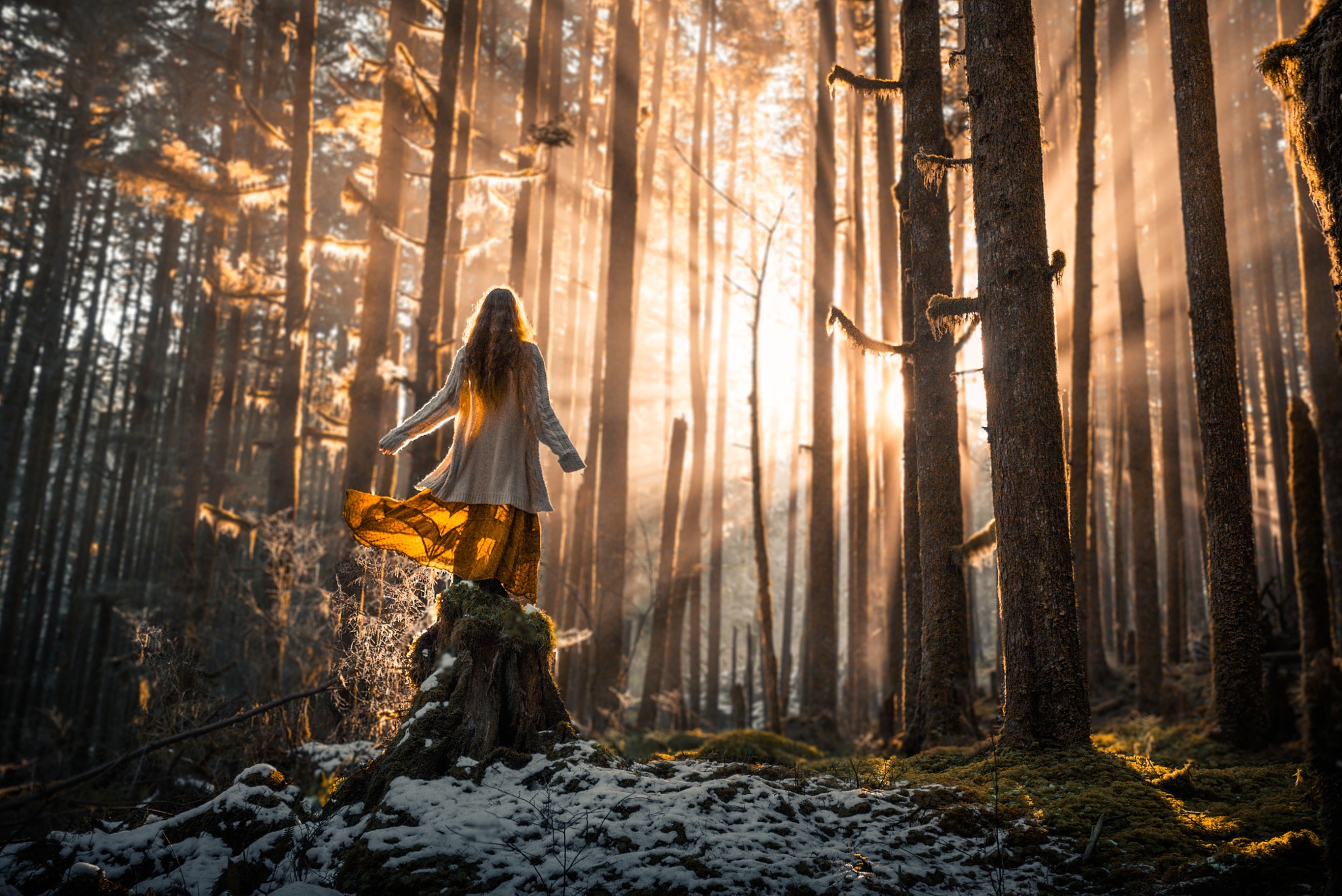 Description: A woman in a white dress standing in a forest with sunbeams behind her and a trail in the woods.