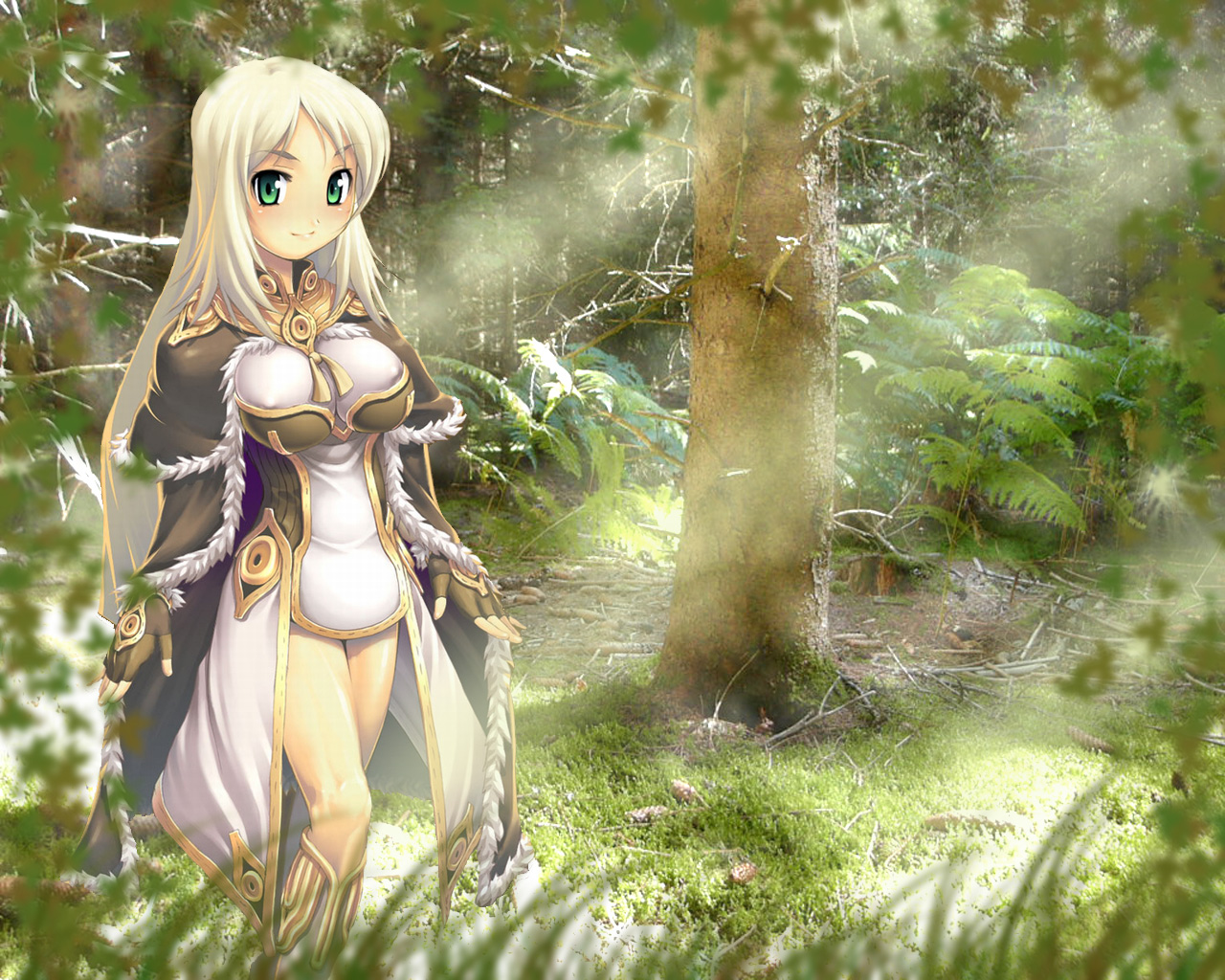 Description: A woman in a white dress standing in a forest with trees and grass in the background.