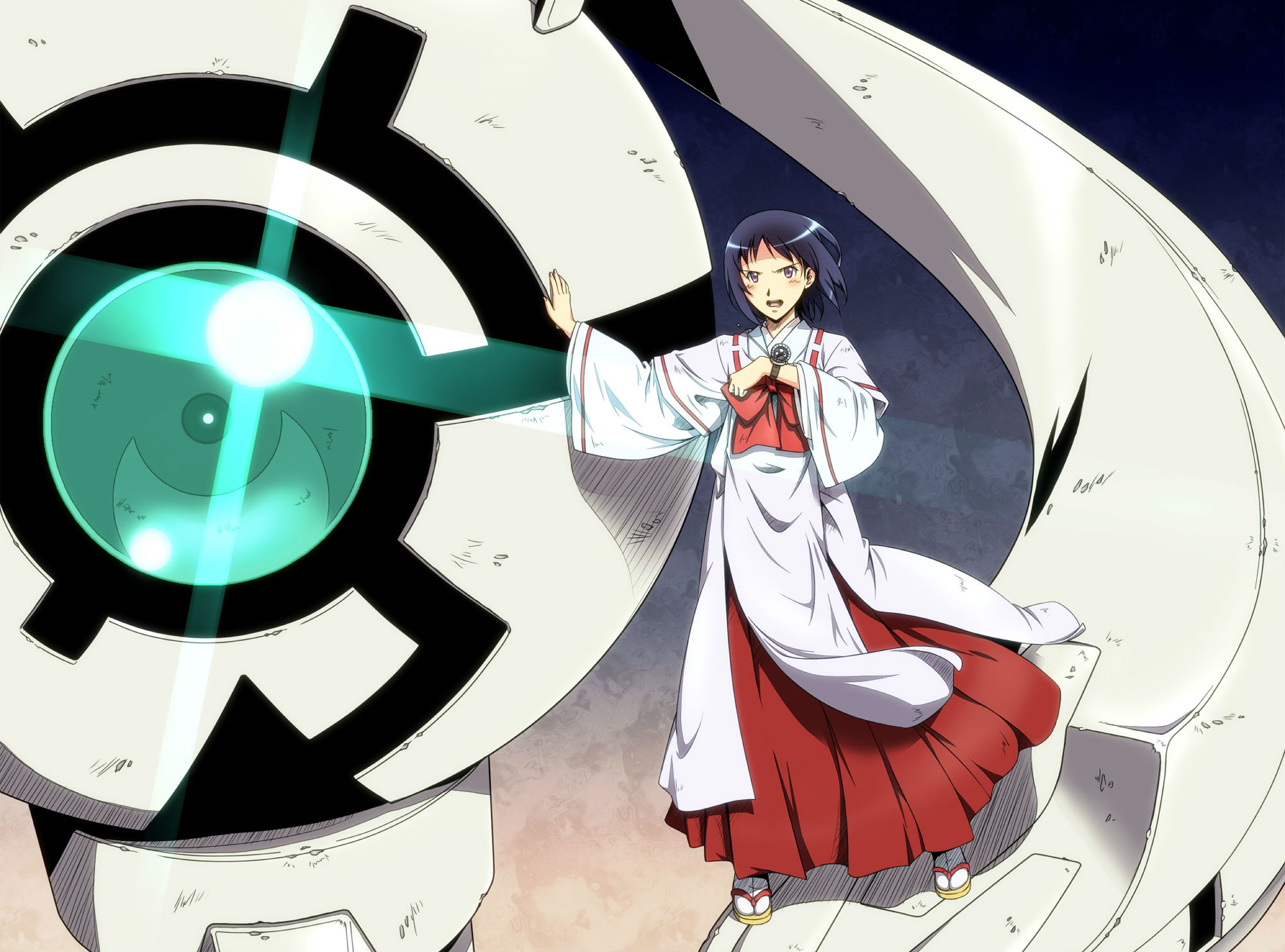 Description: A woman in a white dress standing next to a giant object with a green light on it's face.
