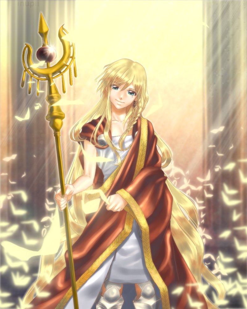 Description: A woman in a white dress holding a golden staff and a golden staff with a red cape on it.