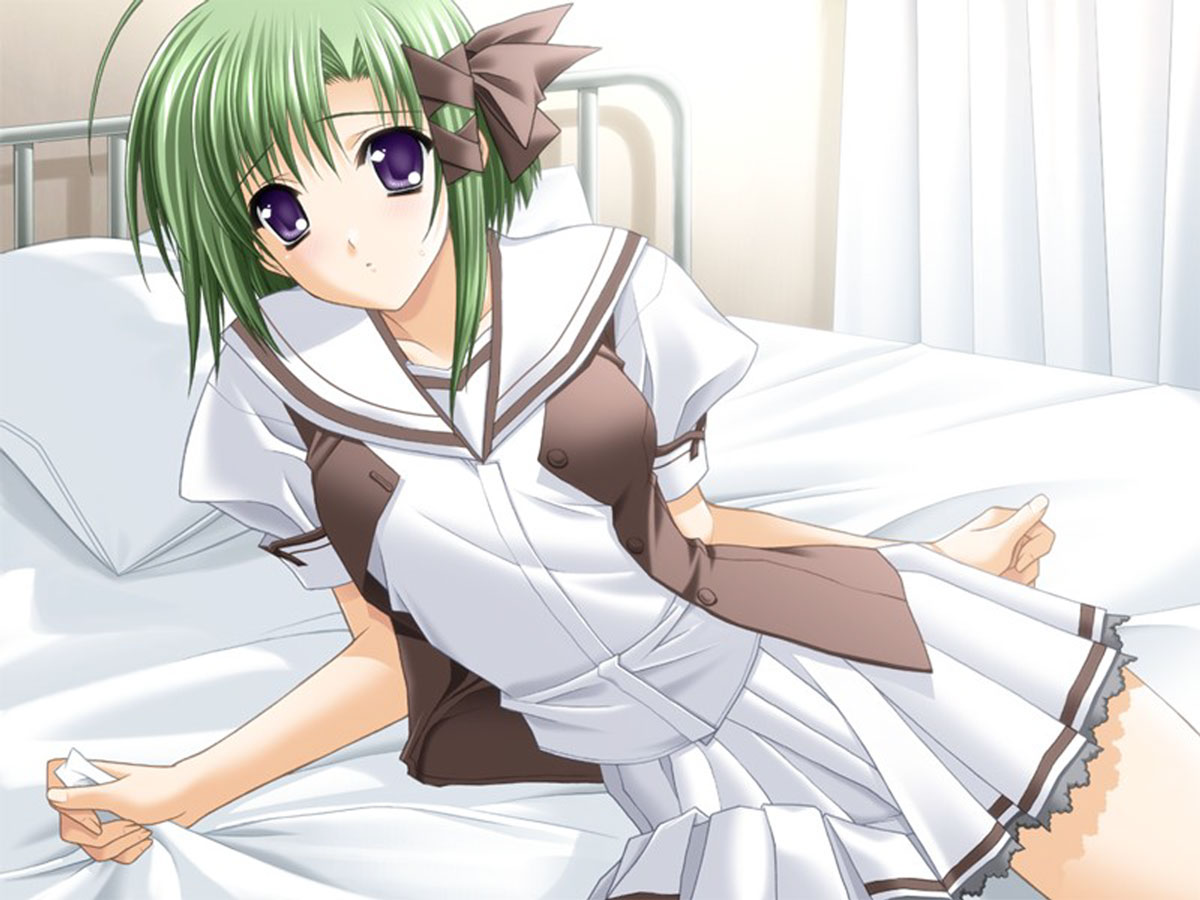 Description: A woman in a white dress sitting on a bed with a green hair and purple eyes and a white shirt.