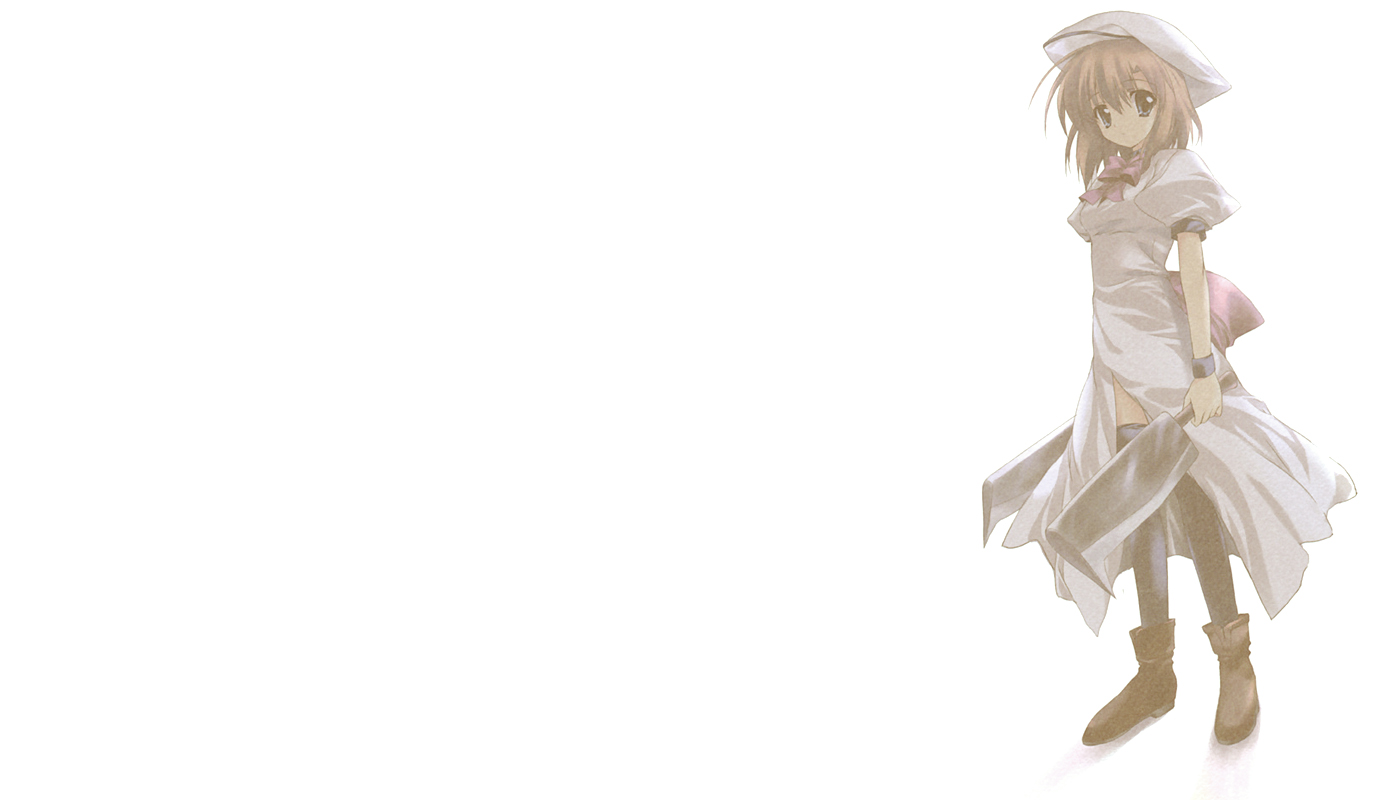 Description: A woman in a white dress and hat standing in the air with her hand on her face and a white background.