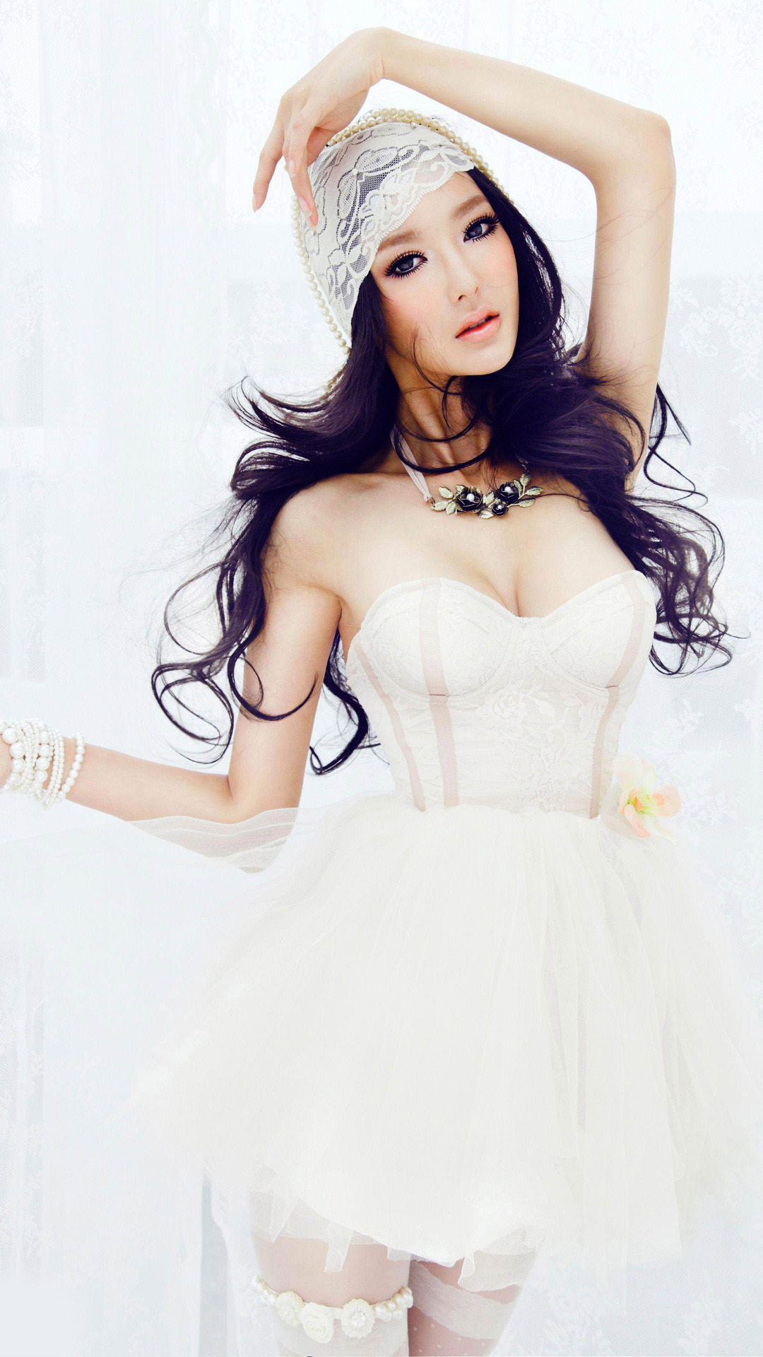 Description: A woman in a white dress and a hat posing for a picture with her hands on her head and her hair in the air.