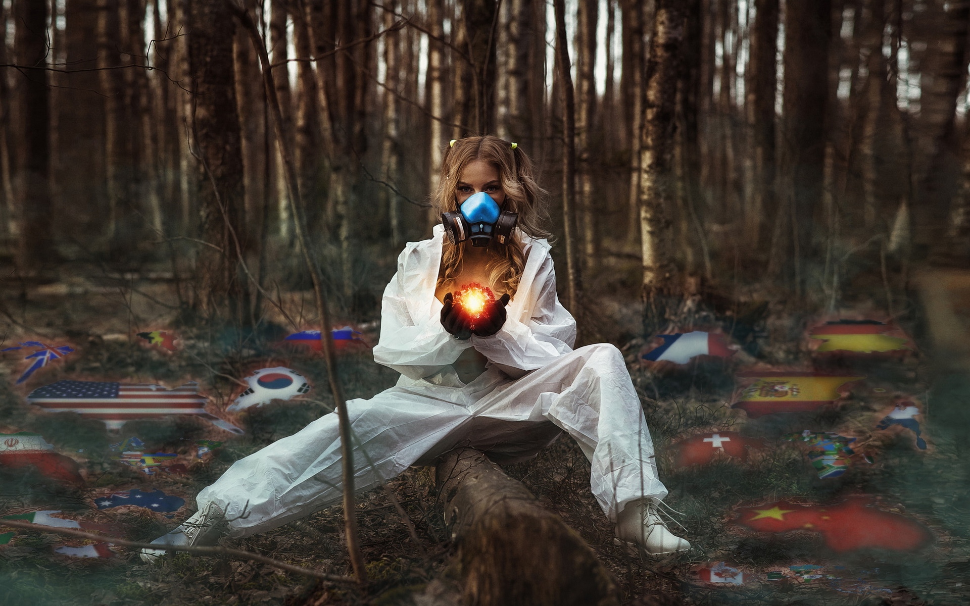 Description: A woman in a white dress holding a light up item in a forest with other items around her and trees.