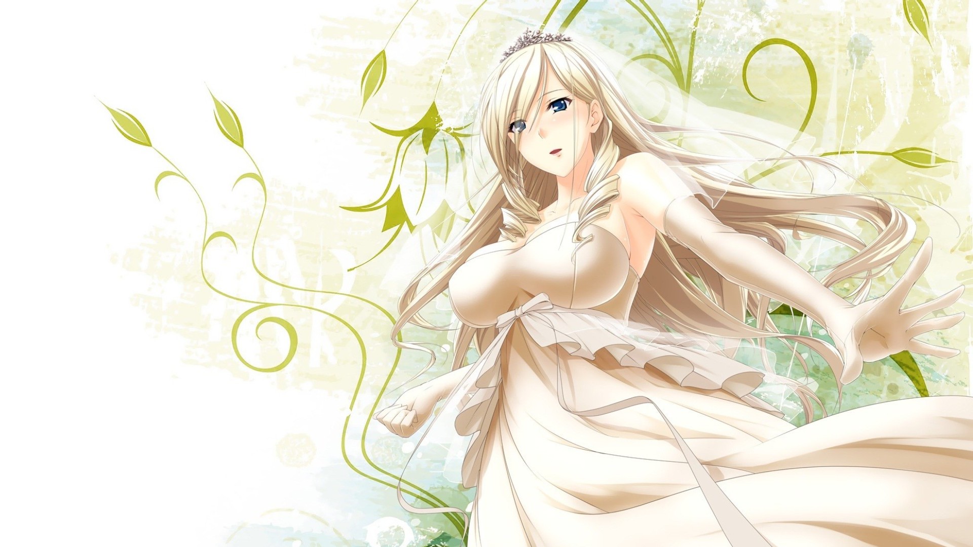 Description: A woman in a white dress with long hair and a tiara on her head.