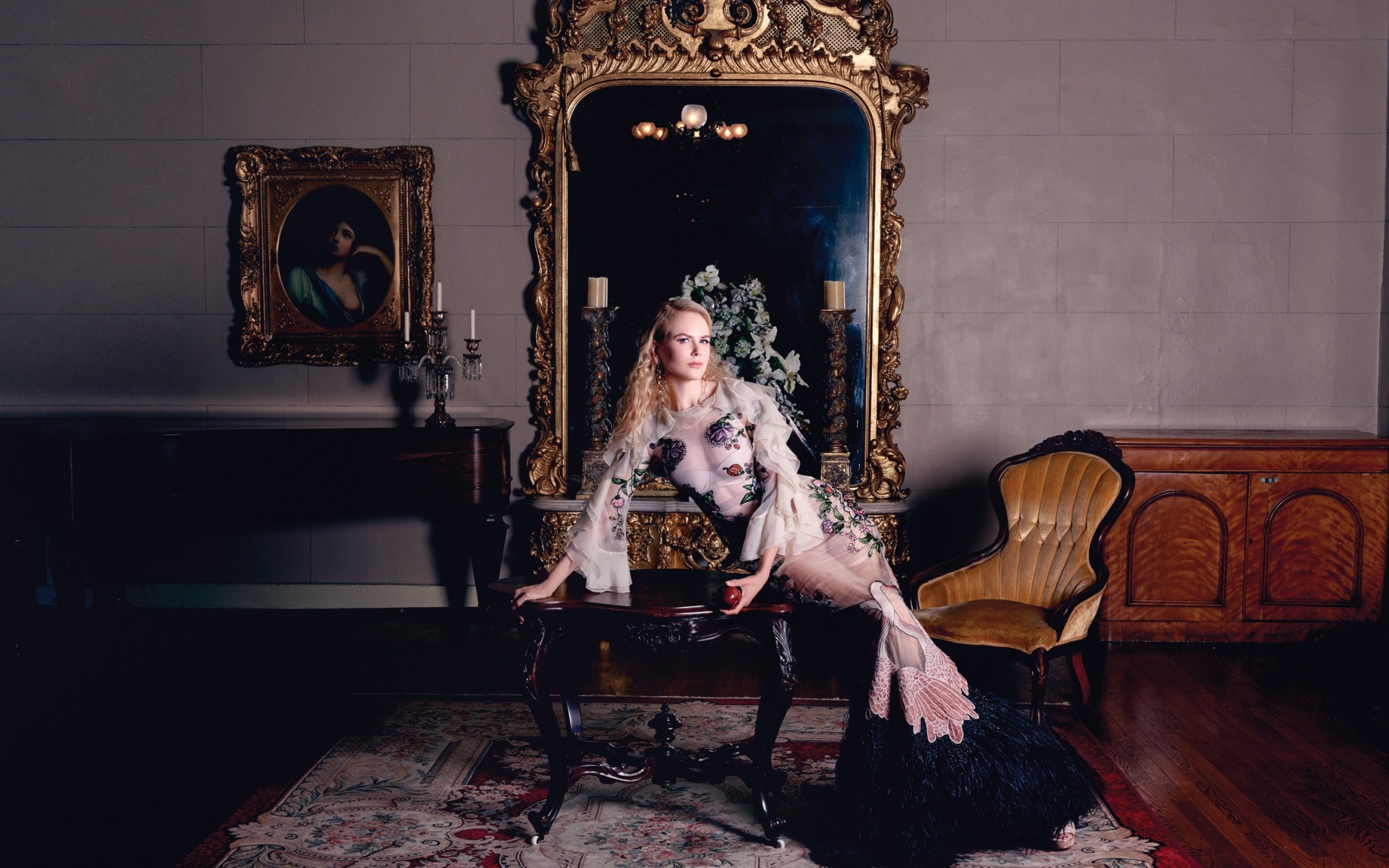 Description: A woman in a white dress sitting on a chair in a room with a mirror and a table with a flower on it.