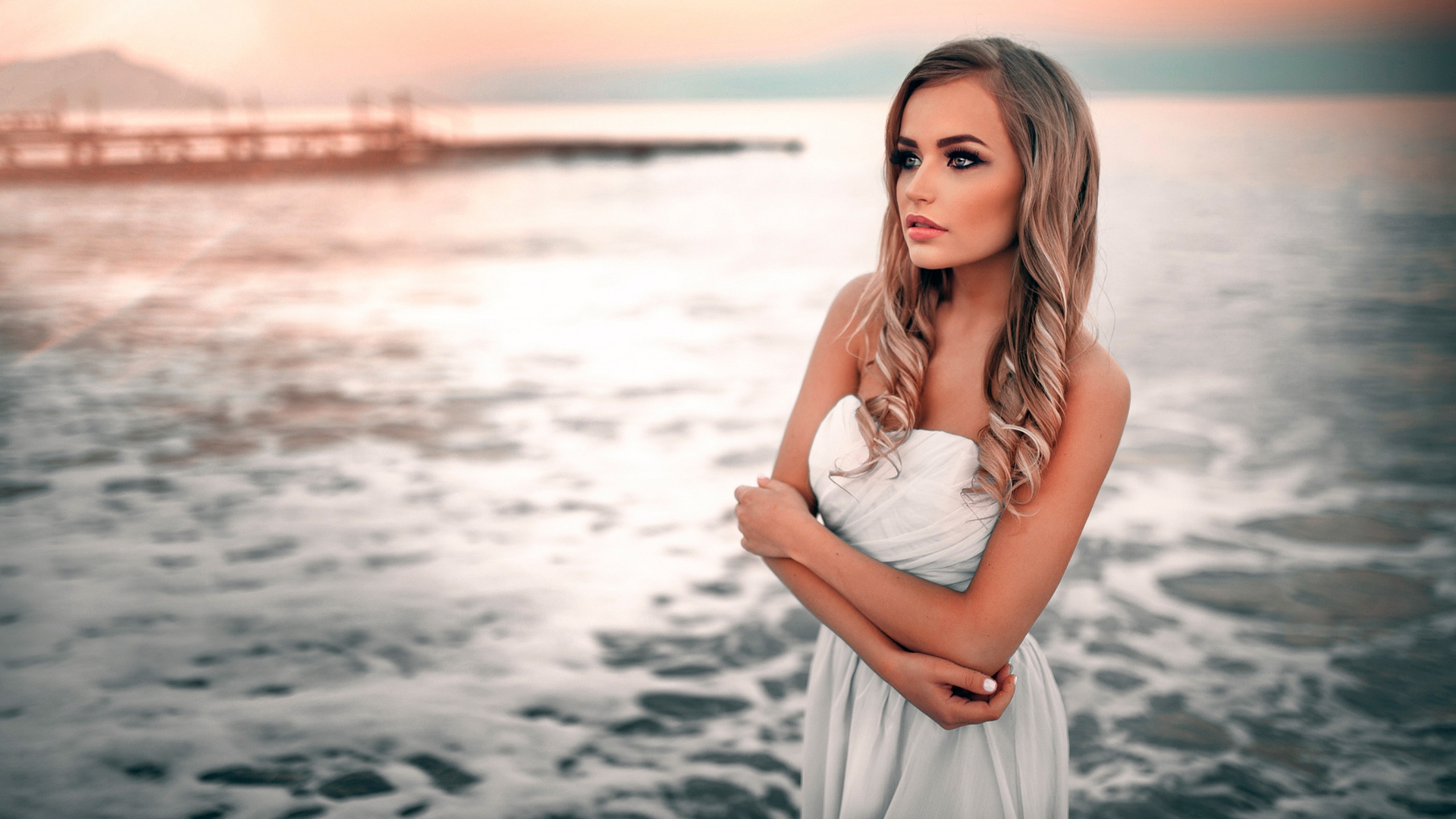 Description: A woman in a white dress standing in front of the ocean with her arms crossed and her head tilted.