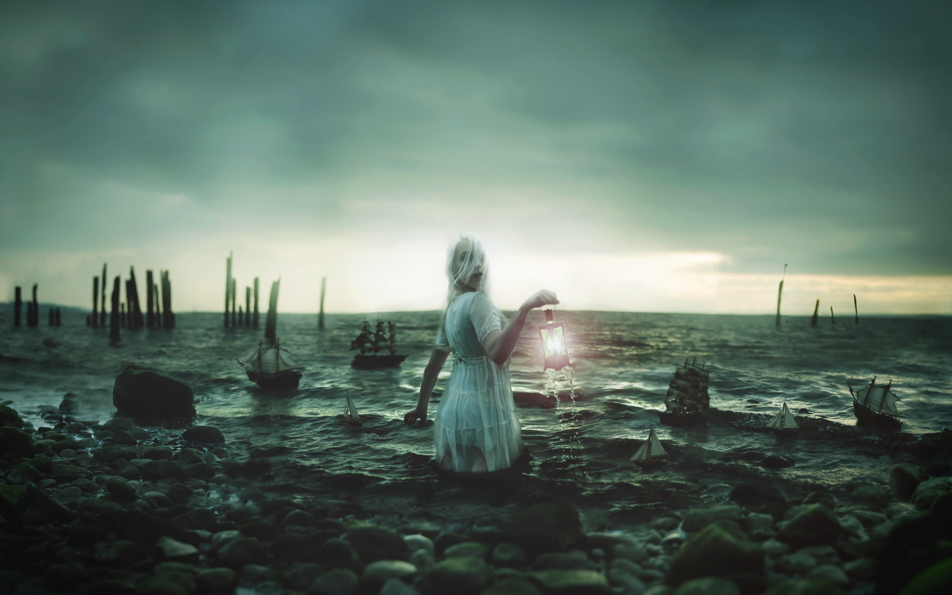 Description: A woman in a white dress standing on rocks near the ocean with a boat in the background and a cloudy sky.