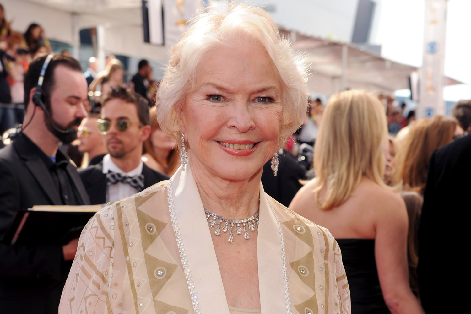 Description: A woman in a white dress and pearls on her necklace and a man in a black suit and tie.