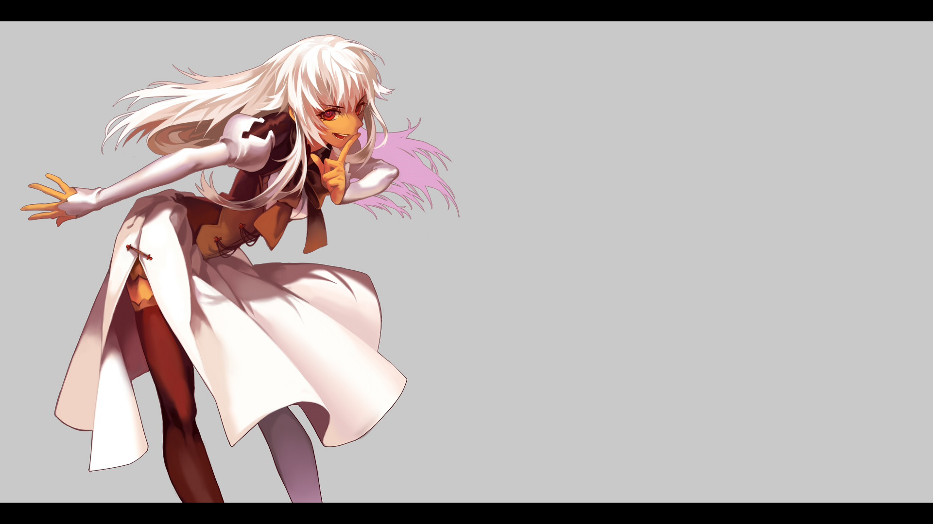 Description: A woman in a white dress with a pink hair and a pink nose is flying through the air with her arms outstretched.