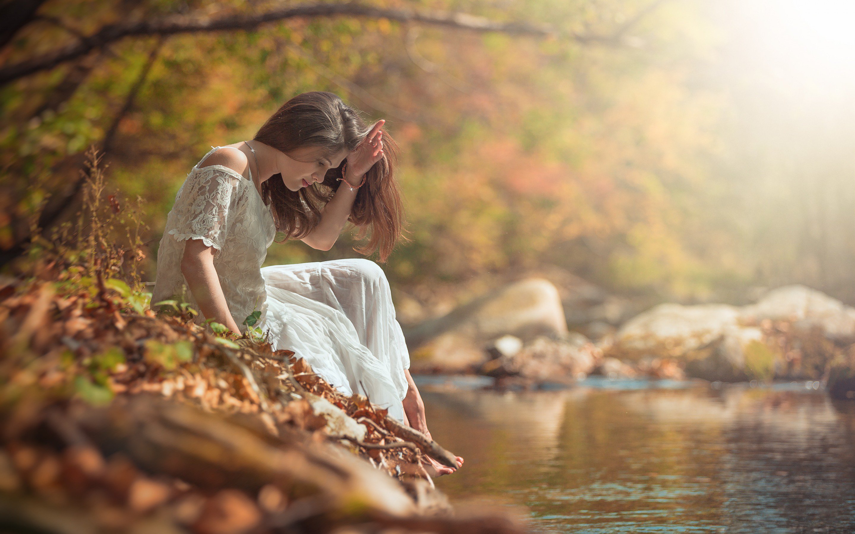 Description: A woman in a white dress sitting on a rock by a river in the fall leaves and looking down.