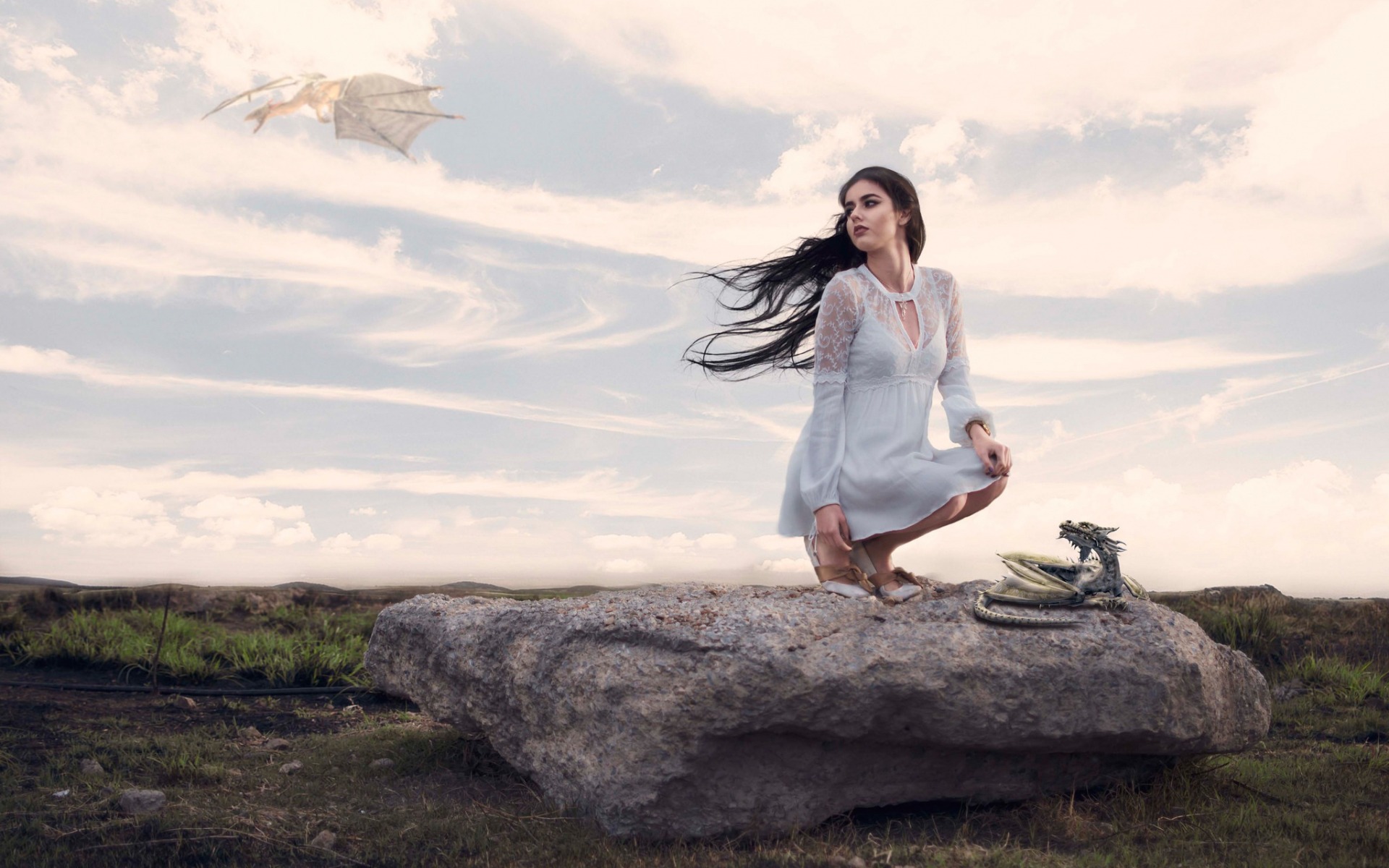 Description: A woman in a white dress is standing on a rock with a bike and a kite in the sky.