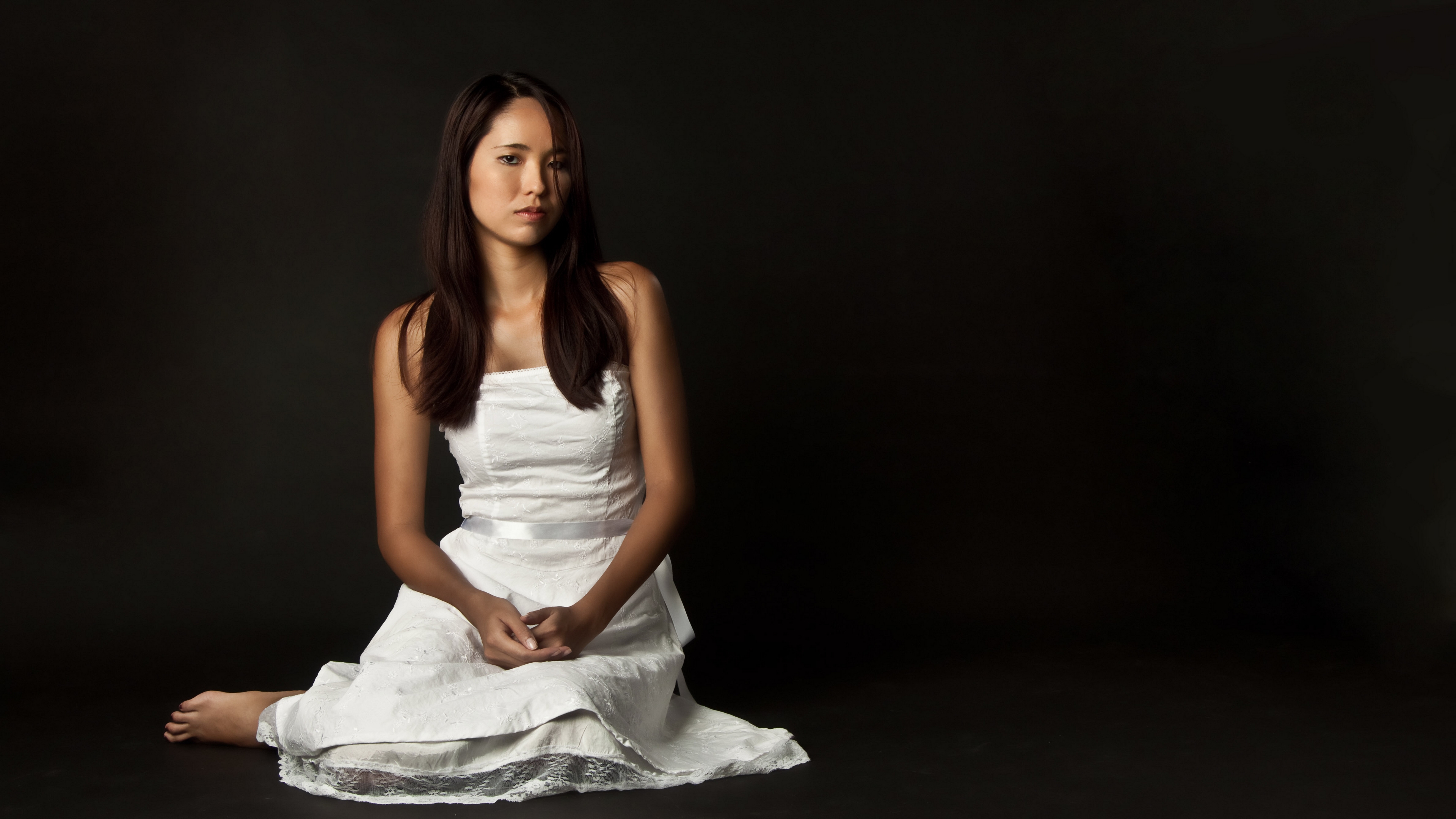 Description: A woman in a white dress sitting on the floor with her hands crossed and looking at the camera with a black background.