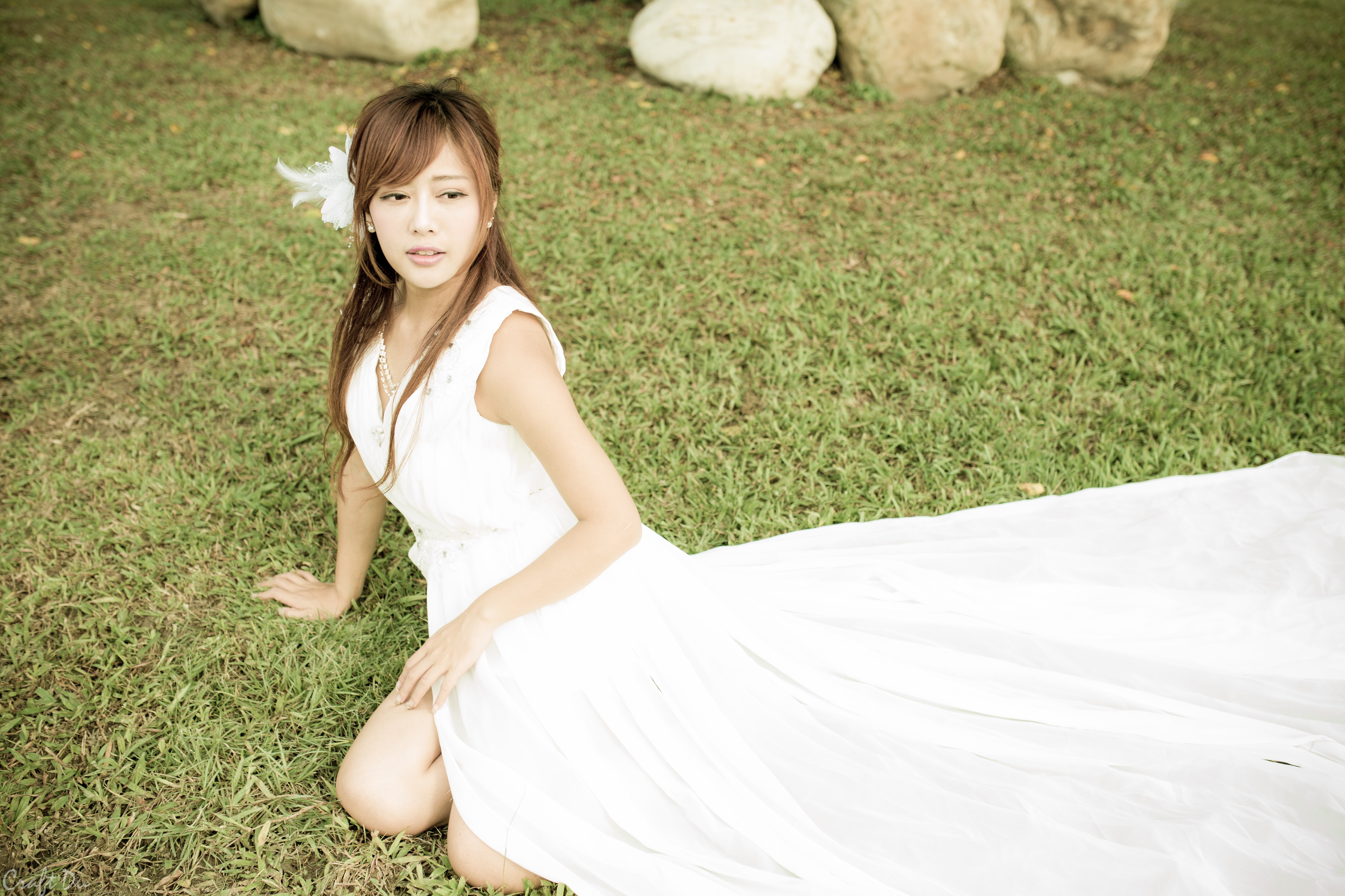 Description: A woman in a white dress sitting on the grass with sheep in the background and a white dress on.