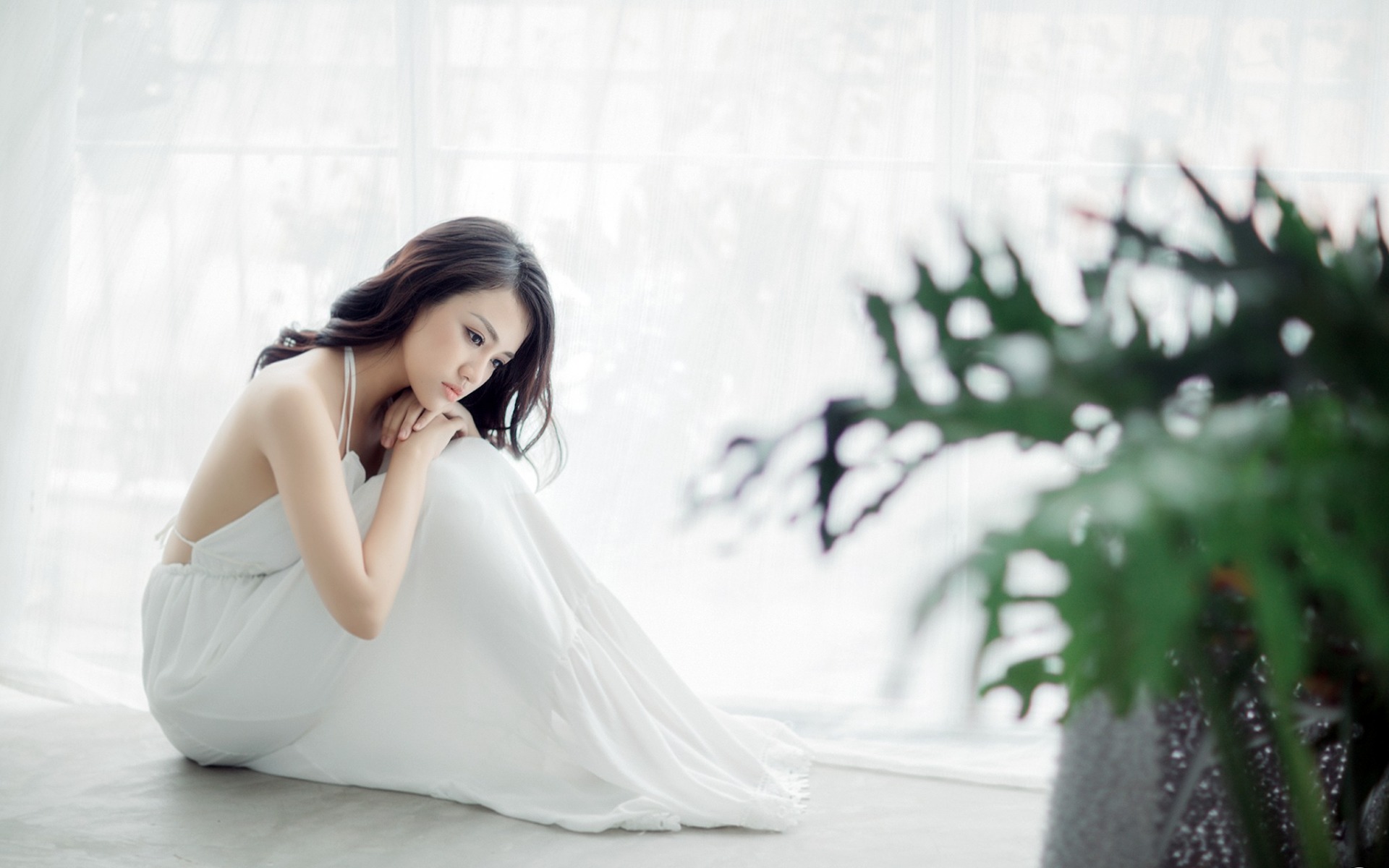 Description: A woman in a white dress sitting on the floor next to a plant and a window with a white curtain.