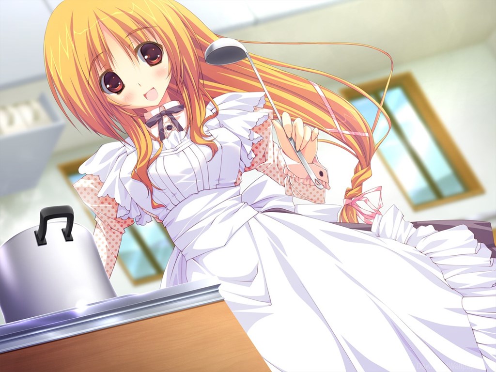 Description: A woman in a white dress is sitting at a table with a pot and a pan on it and a kettle.